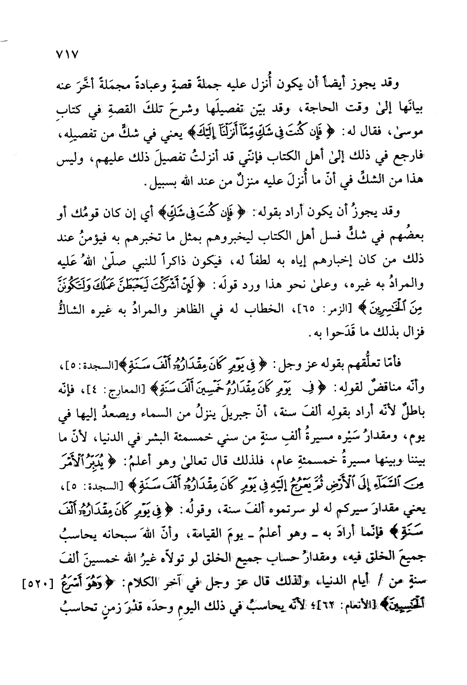 ولا بأن الجزاء وقع أو لم يقع، بل ليس فيها إلا بيان أن ماهية ذلك الشرط مستلزمة لماهية ذلك الجزاء فقط، والدليل عليه أنك إذا قلت إن كانت الخمسة زوجاً كانت منقسمة بمتساويين، فهو كلام حق، لأن معناه أن كون الخمسة زوجاً يستلزم كونها منقسمة بمتساويين، ثم لا يدل هذا الكلام على أن الخمسة زوج ولا على أنها منقسمة بمتساويين فكذا ههنا هذه الآية، تدل على أنه لو حصل هذا الشك لكان الواجب فيه هو فعل كذا وكذا، فأما إن هذا الشك وقع أو لم يقع، فليس في الآية دلالة عليه، والفائدة في إنزال هذه الآية على الرسول أن تكثير الدلائل وتقويتها مما يزيد في قوة اليقين وطمأنينة النفس وسكون الصدر، ولهذا السبب أكثر الله في كتابه من تقرير دلائل التوحيد والنبوة.