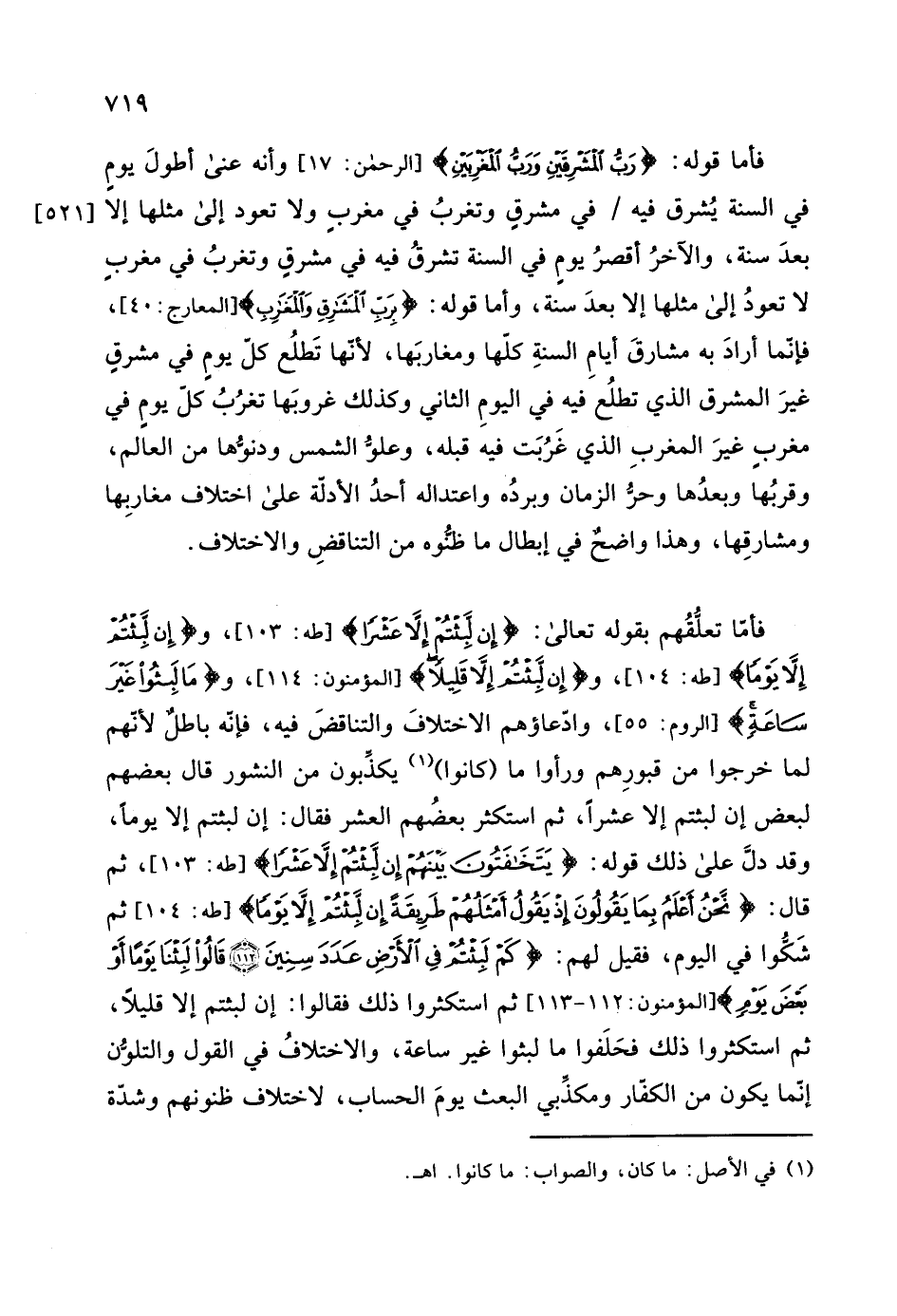 و (إِنْ لَبِثْتُمْ إِلَّا قَلِيلًا) ، و (مَا لَبِثُوا غَيْرَ سَاعَةٍ) ، وادّعاؤهم الاختلافَ والتناقضَ فيه، فإنه باطل لأنهم لما خرجوا من قبورِهم ورأوا ما كانوا يكذبون من النشور قال بعضهم لبعض إن لبثتم إلا عشراً، ثم استكثر بعضُهم العشر فقال: إن لبثتم إلا يوماً.