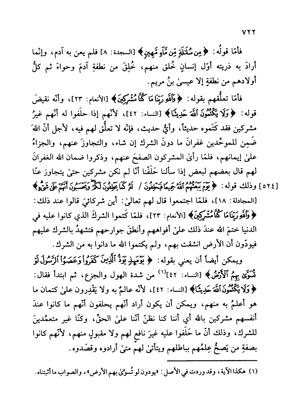 مشركين فقد كَتَموه حديثا، وأيُّ حديث، فإنه لا تعلُّق لهم فيه، لأجل أن اللهَ ضَمِن للموحدين غفرانَ ما دونَ الشرك إن شاء، والتجاوزَ عنهم، والجزاءُ على إيمانهم، فلمَّا رأى المشركون الصفحَ عنهم، وذكروا ضمان الله الغفرانَ لهم قال بعضهم لبعض إذا سألنا حَلَفْنا أنا لم نكن مشركين حتى يتجاوز عنا وذلك قوله: (يَوْمَ يَبْعَثُهُمُ اللَّهُ جَمِيعًا فَيَحْلِفُونَ لَهُ كَمَا يَحْلِفُونَ لَكُمْ وَيَحْسَبُونَ أَنَّهُمْ عَلَى شَيْءٍ) ، فلمَّا اجتمعوا قال لهم تعالى: أين شركائيَ قالوا عند ذلك: (وَاللَّهِ رَبِّنَا مَا كُنَّا مُشْرِكِينَ) ، فلمَّا كَتموا الشركَ الذي كانوا عليه في الدنيا ختمَ الله عندَ ذلك على أفواههم وأنطقَ جوارحهم فتشهدُ بالشرك عليهم فيودُّون أن الأرض انشقت بهم، ولم يكتموا الله ما دانوا به من الشرك.