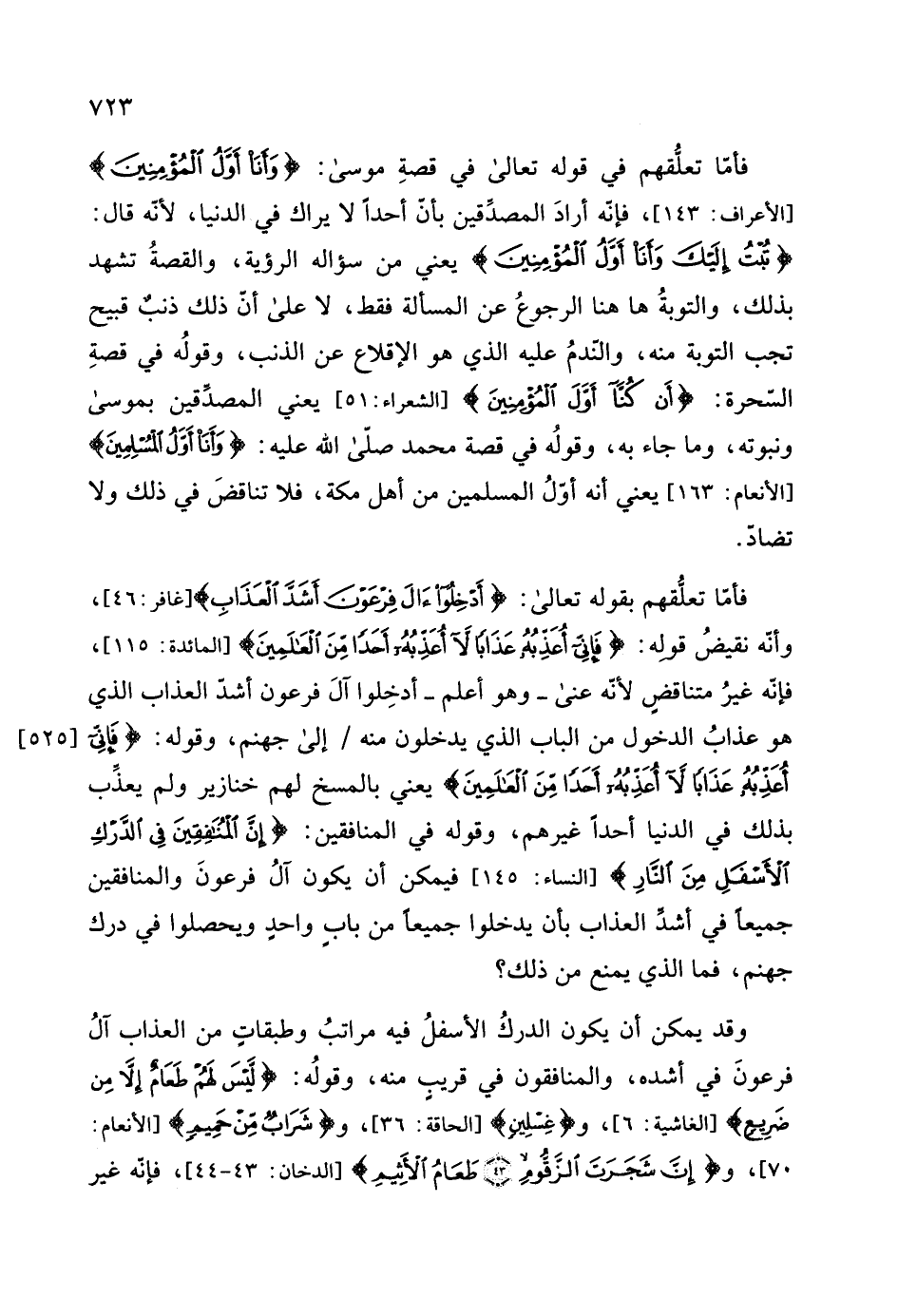 فإنّه غيرُ متناقضٍ لأنه عنى - وهو أعلم - أدخِلوا آلَ فرعون أشد العذاب الذي هو عذابُ الدخول من الباب الذي يدخلون منه إلى جهنم، وقوله: (فَإِنِّي أُعَذِّبُهُ عَذَابًا لَا أُعَذِّبُهُ أَحَدًا مِنَ الْعَالَمِينَ) يعني بالمسخ لهم خنازير ولم يعذب بذلك في الدنيا أحداً غيرهم، وقوله في المنافقين: (إِنَّ الْمُنَافِقِينَ فِي الدَّرْكِ الْأَسْفَلِ مِنَ النَّارِ) ، فيمكن أن يكون آلُ فرعونَ والمنافقون