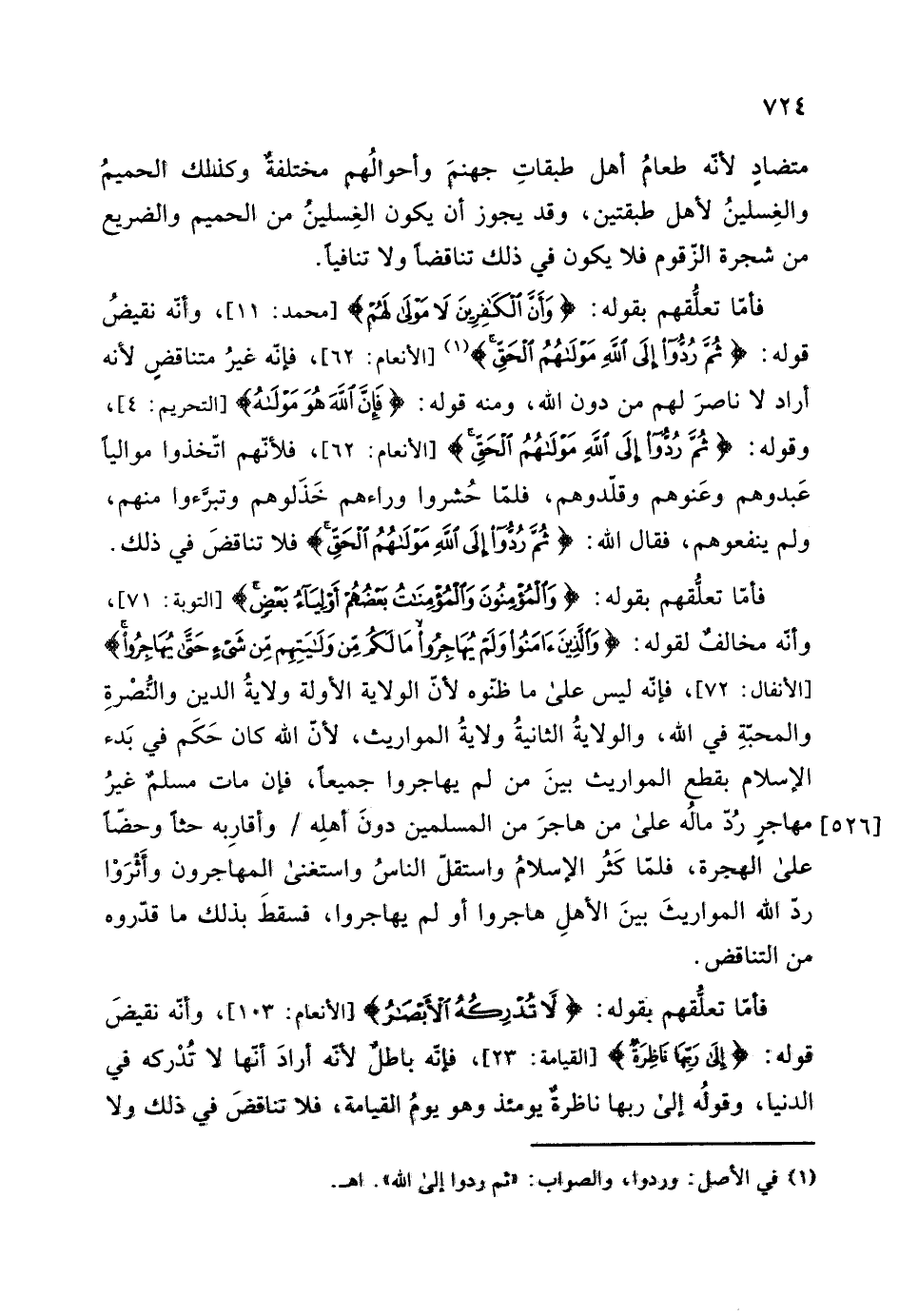 وأنّه مخالف لقوله: (وَالَّذِينَ آمَنُوا وَلَمْ يُهَاجِرُوا مَا لَكُمْ مِنْ وَلَايَتِهِمْ مِنْ شَيْءٍ حَتَّى يُهَاجِرُوا) ، فإنه ليس على ما ظنّوه لأن الولاية الأولة ولايةُ الدين والنُّصْرةِ والمحبةِ في الله، والولايةُ الثانيةُ ولايةُ المواريث، لأن الله كان حَكَم في بَدء الإسلام بقطع المواريث بينَ من لم يهاجروا جميعا، فإن مات مسلم غيرُ