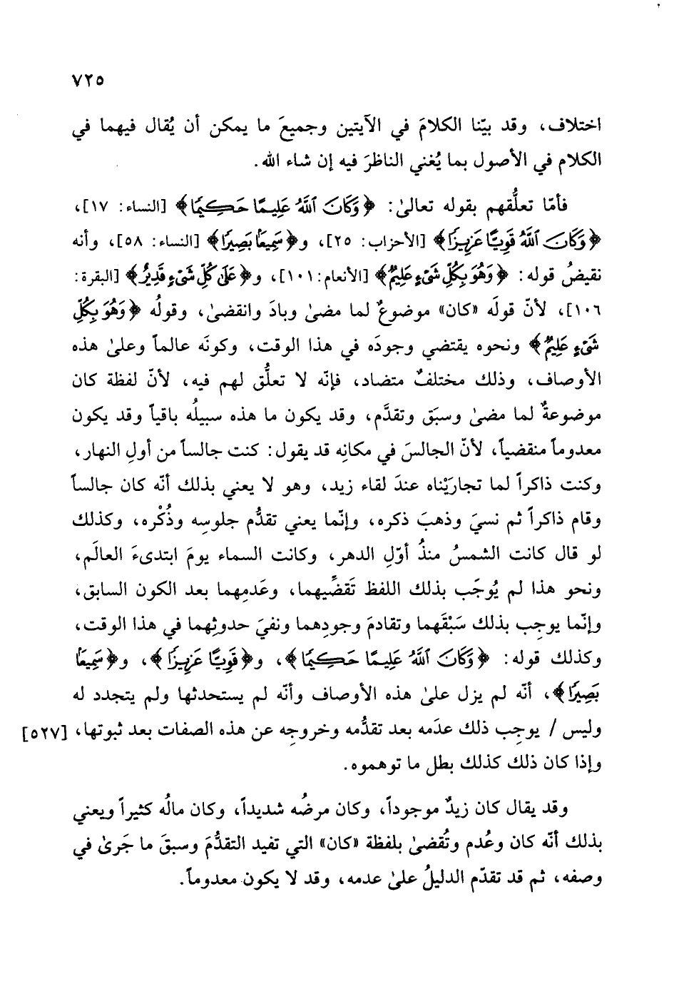 فأمَّا تعلُّقهم بقوله تعالى: (وَكَانَ اللَّهُ عَلِيمًا حَكِيمًا) ، (وَكَانَ اللَّهُ قَوِيًّا عَزِيزًا) ، و (سَمِيعًا بَصِيرًا) ، وأنه نقيض قوله: (وَهُوَ بِكُلِّ شَيْءٍ عَلِيمٌ) ، (عَلَى كُلِّ شَيْءٍ قَدِيرٌ) ، لأن قولَه "كان" موضوع لما مضى وبادَ وانقضى، وقولُه (وَهُوَ بِكُلِّ شَيْءٍ عَلِيمٌ) ونحوه يقتضي وجودَه في هذا الوقت، وكونَه عالما وعلى هذه الأوصاف، وذلك مختلف متضاد، فإنه لا تعلُّق لهم فيه، لأن لفظة كان