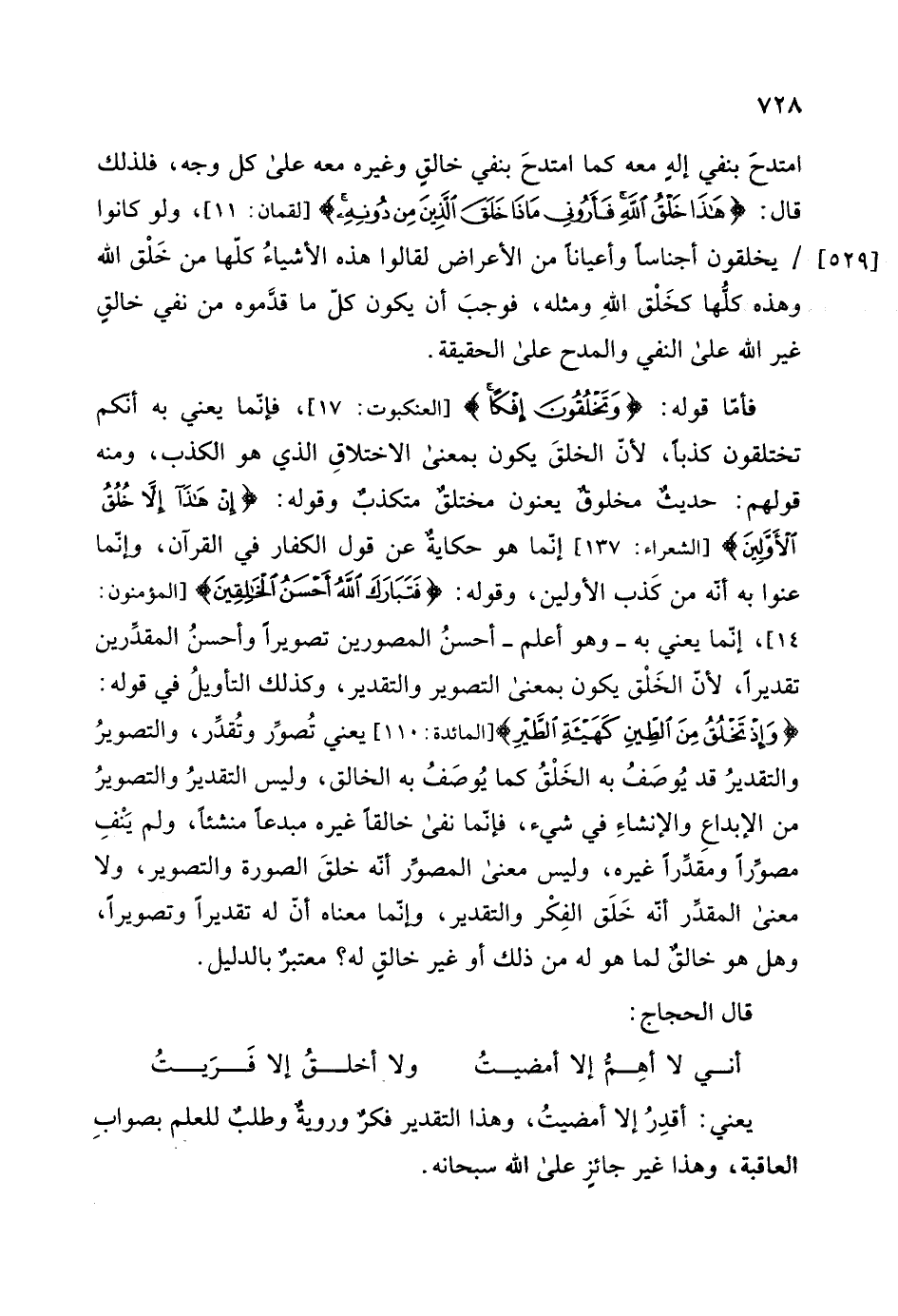 قال: (هَذَا خَلْقُ اللَّهِ فَأَرُونِي مَاذَا خَلَقَ الَّذِينَ مِنْ دُونِهِ) ، ولو كانوا يخلقون أجناسا وأعيانا من الأعراض لقالوا هذه الأشياءُ كلها من خَلْق الله وهذه كلها كخَلْق اللهِ ومثله، فوجبَ أن يكون كل ما قدموه من نفي خالق غير الله على النفي والمدح على الحقيقة.