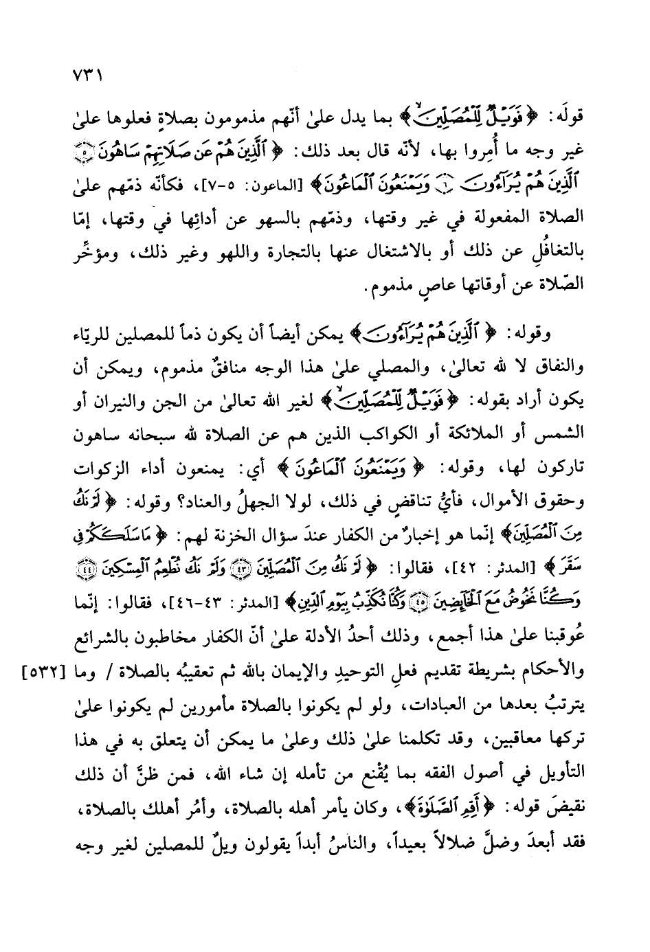 فقالوا: إنما عُوقبنا على هذا أجمع، وذلك أحدُ الأدلة على أن الكفار مخاطبون بالشرائع والأحكام بشريطة تقديم فعلِ التوحيدِ والإيمان بالله ثم تعقيبُه بالصلاة وما يترتبُ بعدها من العبادات، ولو لم يكونوا بالصلاة مأمورين لم يكونوا على تركها معاقبين، وقد تكلمنا على ذلك وعلى ما يمكن أن يتعلق به في هذا التأويل في أصول الفقه بما يُقْنع من تأمله إن شاء الله، فمن ظن أن ذلك نقيضَ قوله: (أَقِمِ الصَّلَاةَ) ، وكان يأمر أهله بالصلاة، وأمُر أهلك بالصلاة، فقد أبعدَ وضلَّ ضلالاً بعيداً، والناسُ أبداً يقولون ويلٌ للمصلين لغير وجه الله تعالى