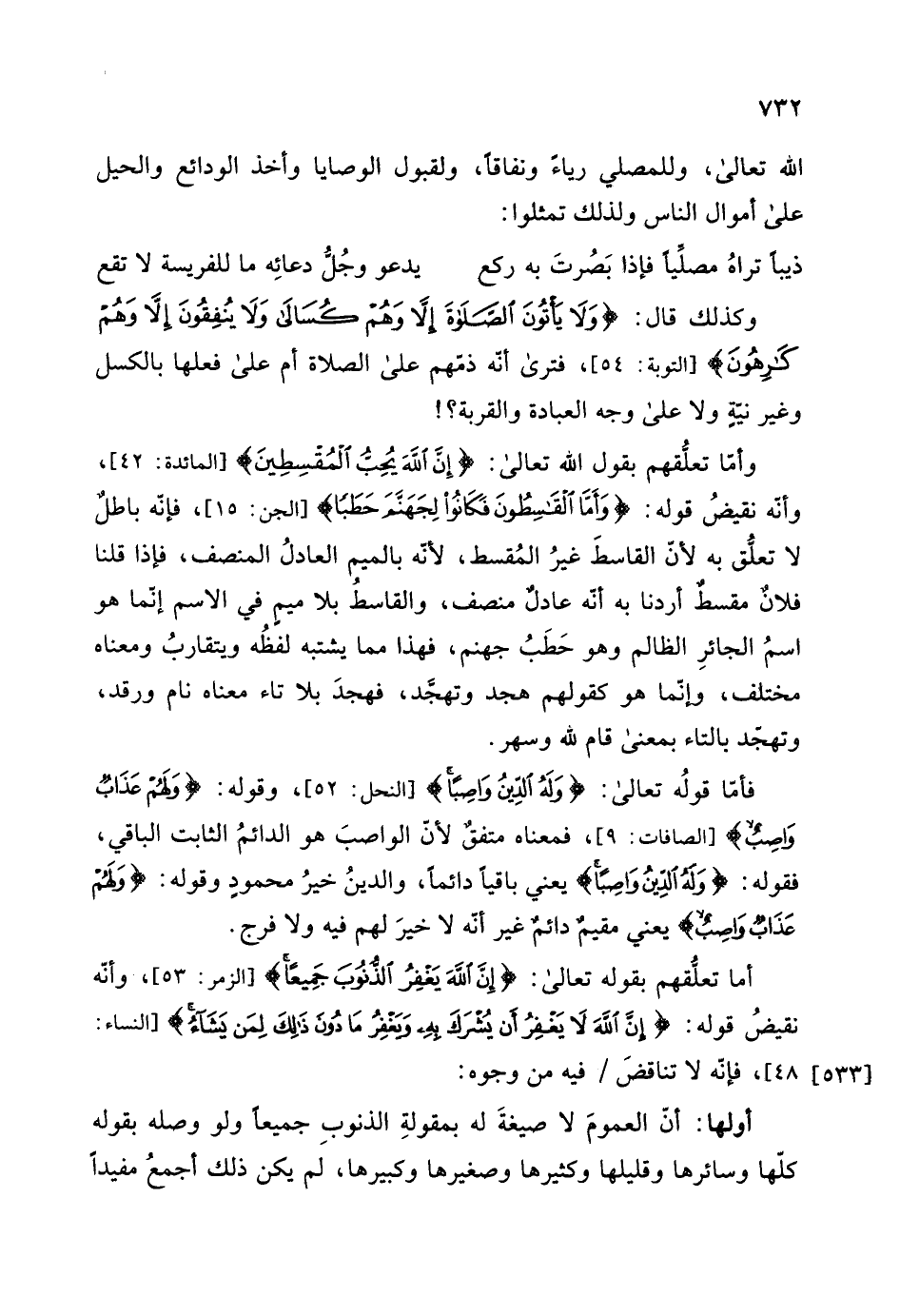 أولها: أن العمومَ لا صيغةَ له بمقولةِ الذنوبِ جميعا ولو وصله بقوله