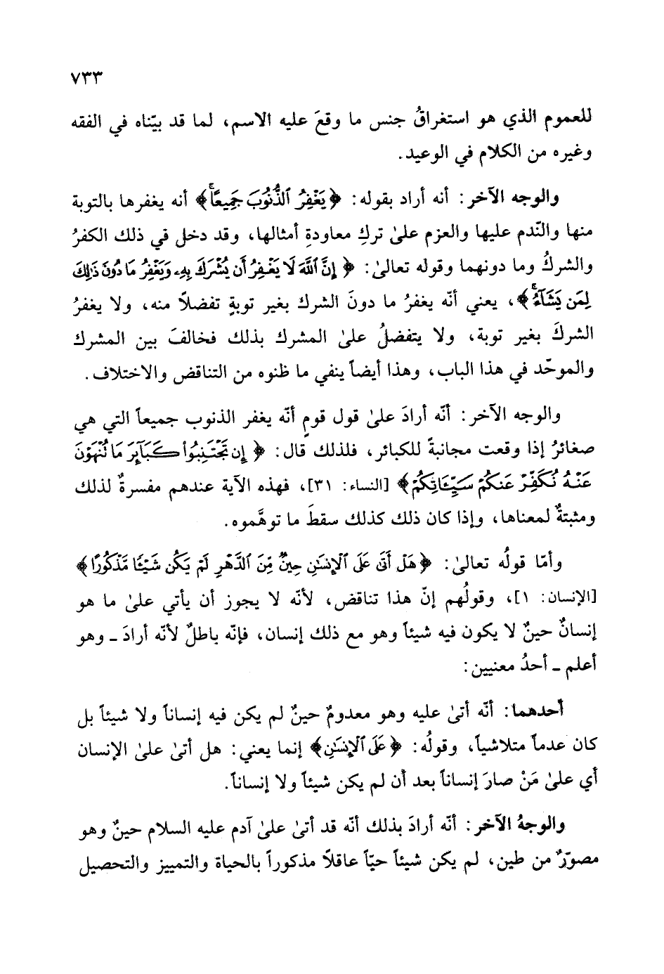 والشركُ وما دونهما وتولى تعالى: (إِنَّ اللَّهَ لَا يَغْفِرُ أَنْ يُشْرَكَ بِهِ وَيَغْفِرُ مَا دُونَ ذَلِكَ لِمَنْ يَشَاءُ) ، يعني أنّه يغفرُ ما دونَ الشرك بغير توبةٍ تفضلاً منه، ولا يغفرُ الشركَ بغير توبة، ولا يتفضلُ على المشرك بذلك فخالفَ بين المشرك