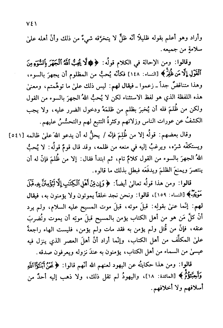 وهذا متناقض جدا - زعموا - فيقال لهم: ليس ذلك على ما توهمتم، ومعنى هذه اللفظة الذي هو لفظ الاستثناء لكن لا يُحبُّ اللهُ الجهرَ بالسوء من القول ولكن من ظُلمَ فله أن يُخبرَ بظلمِ من ظلمَهُ ودخول الضرر عليه، ولا يجب الكشفُ عن عورات الناس وزلاتهم وكثرةُ التتبع لهم والتجسسُ عليهم.