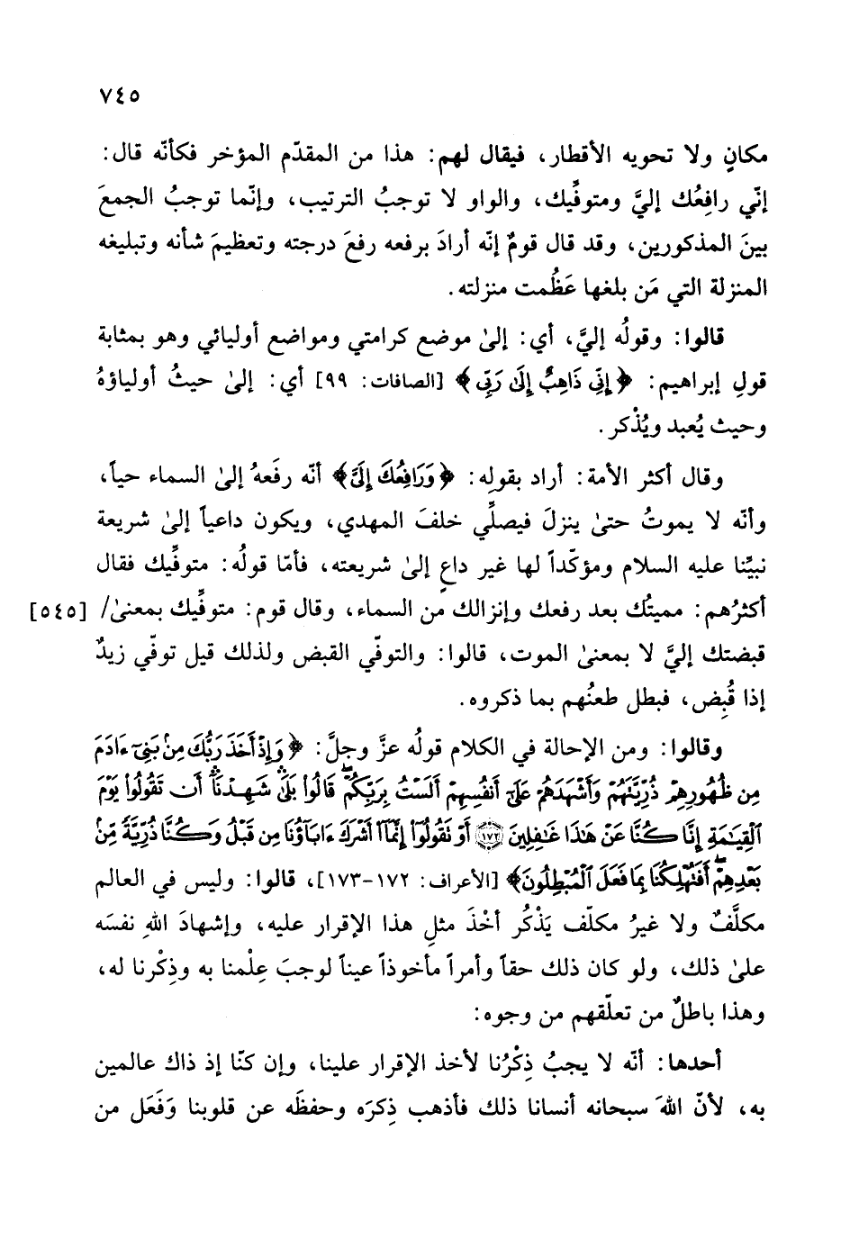 وليس هو في مكانِ ولا تحويه الأقطار، فيقال لهم: هذا من المقدم المؤخر فكأنّه قال: إتي رافِعُك إليَّ ومتوفيك، والواو لا توجبُ الترتيب، وإنما توجبُ الجمعَ بينَ المذكورين، وقد قال قوم إنه أرادَ برفعه رفعَ درجته وتعظيمَ شأنه وتبليغه المنزلة التي مَن بلغها عَظُمت منزلته.