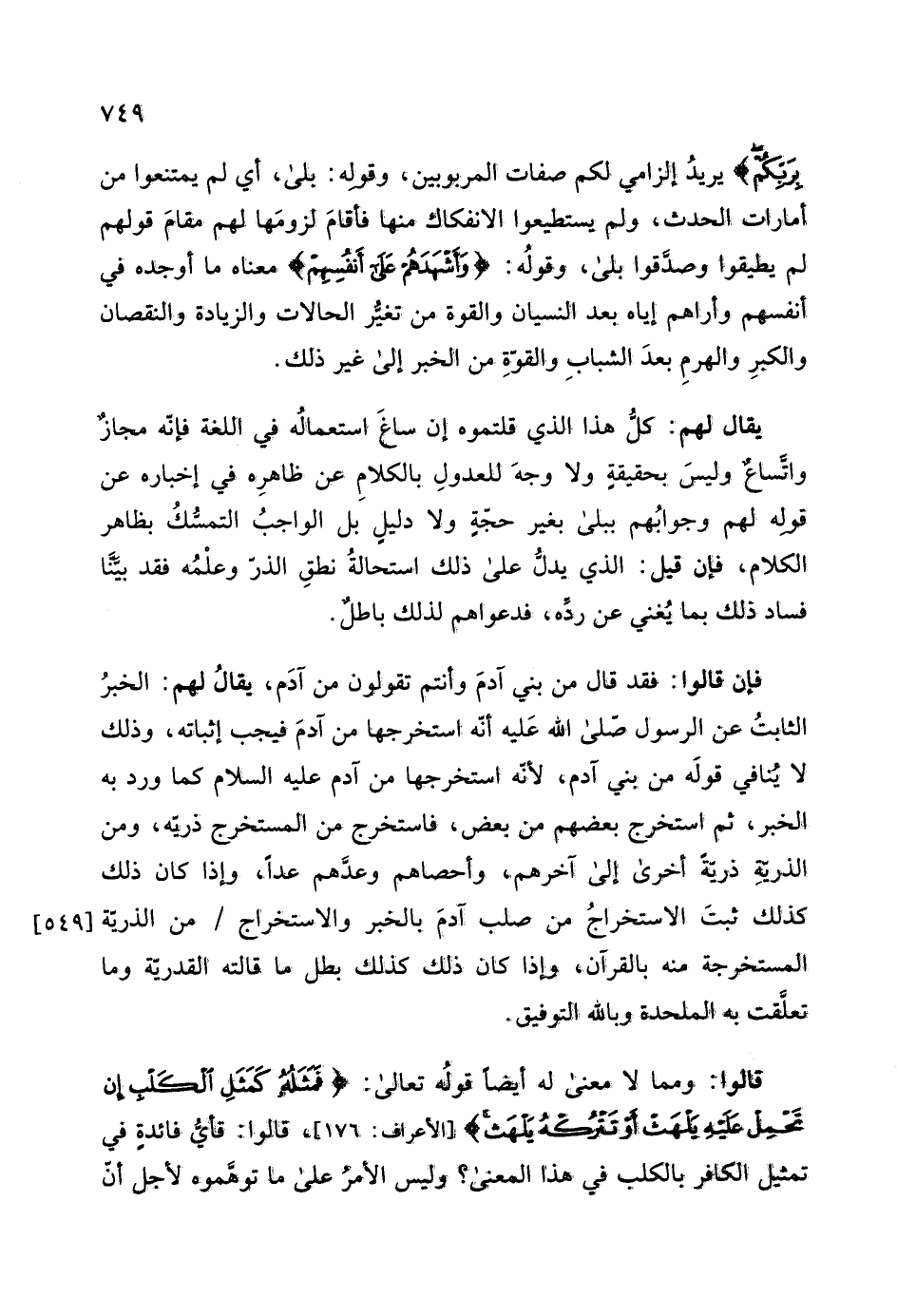 الثابتُ عن الرسول - صلى الله عليه وسلم - أنه: استخرجها من آدمَ - فيجب إثباته، وذلك لا يُنافي قولَه من بني آدم، لأنه استخرجها من آدم عليه السلام كما ورد به الخبر، ثم استخرج بعضهم من بعض، فاستخرج من المستخرج ذريةً، ومن الذرية ذريةً أخرى إلى آخرهم،، وأحصاهم وعدَّهم عدًّا، وإذا كان ذلك كذلك ثبتَ الاستخراجُ من صلب آدمَ بالخبر والاستخراج من الذرية المستخرجة عنه بالقرآن،، وإذا كان ذلك كذلك بطل ما قالته القدريّة وما تعلقت به الملحدة وبالله. التوفيق