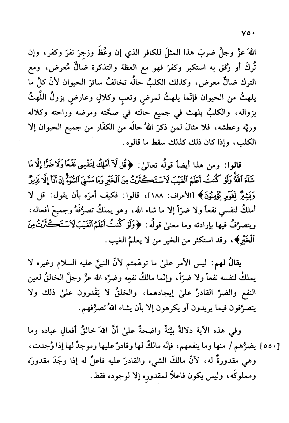 قالوا: فكيف أمرَه بأن يقول: (قُلْ لَا أَمْلِكُ لِنَفْسِي نَفْعًا وَلَا ضَرًّا إِلَّا مَا شَاءَ اللَّهُ) ، وهو يملكُ تصرُفَهُ وجميعَ أفعاله، ويتصرَّفُ فيها بإرادته وما معنى قولُه: (وَلَوْ كُنْتُ أَعْلَمُ الْغَيْبَ لَاسْتَكْثَرْتُ مِنَ الْخَيْرِ) ، وقد استكثر من الخير من لا يعلمُ الغيب.