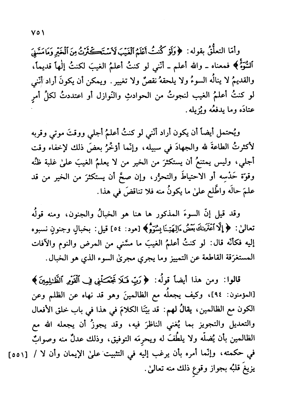 وأمَّا التعلُّقُ بقوله: (وَلَوْ كُنْتُ أَعْلَمُ الْغَيْبَ لَاسْتَكْثَرْتُ مِنَ الْخَيْرِ وَمَا مَسَّنِيَ السُّوءُ) فمعناه - والله أعلم - أنني لو كنتُ أعلمُ الغيبَ لكنتُ إلهاً قديما.