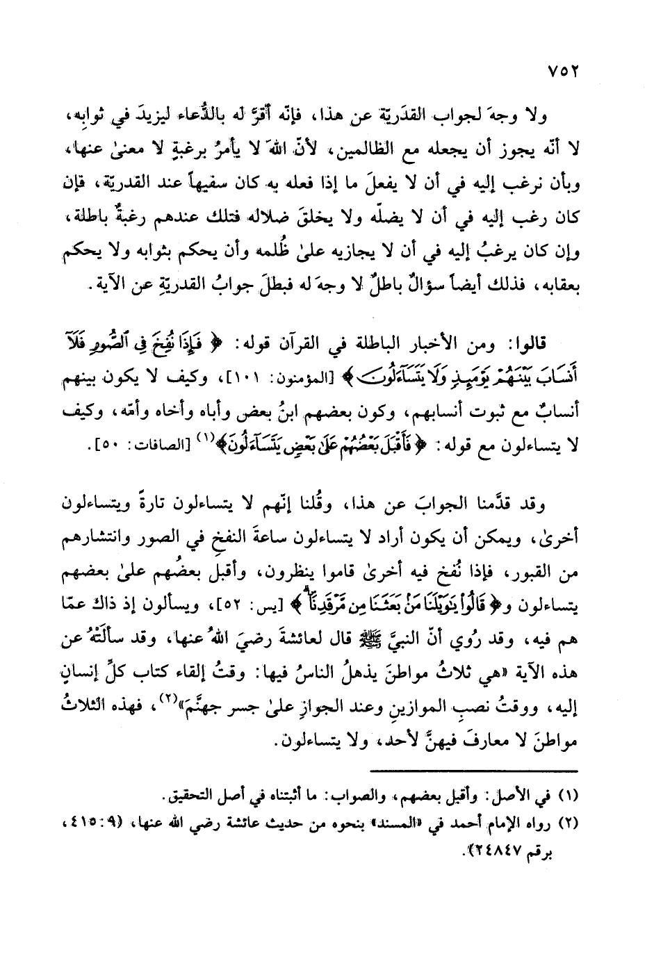 قالوا: ومن الأخبار الباطلة في القرآن قوله: (فَإِذَا نُفِخَ فِي الصُّورِ فَلَا أَنْسَابَ بَيْنَهُمْ يَوْمَئِذٍ وَلَا يَتَسَاءَلُونَ) ، وكيف لا يكون بينهم أنساب مع ثبوت أنسابهم، وكون بعضهم ابنُ بعض وأباه وأخاه وأمَّه، وكيف لا يتساءلون مع قوله: (وَأَقْبَلَ بَعْضُهُمْ عَلَى بَعْضٍ يَتَسَاءَلُونَ) .