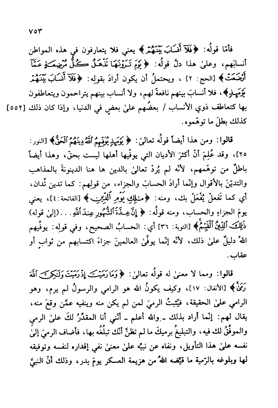 أنسابَهم، وعلى هذا دلَّ قوله: (يَوْمَ تَرَوْنَهَا تَذْهَلُ كُلُّ مُرْضِعَةٍ عَمَّا أَرْضَعَتْ) ، ويحتملُ أن يكون أرادَ بقوله: (فَلَا أَنْسَابَ بَيْنَهُمْ يَوْمَئِذٍ) ، فلا أنسابَ بينهم نافعةَ لهم، ولا أنساب بينهم يتراحمون ويتعاطفون
