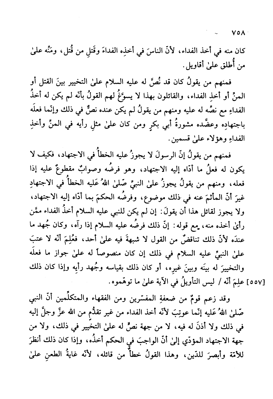 وقد زعم قوم من ضعفةِ المفسّرين ومن الفقهاء والمتكلمين أن النبي - صلى الله عليه وسلم - إنّما عوتبَ لأنه أخذ الفداء من غير تقدُّمٍ من الله عزَ وجل إليه في ذلك ولا أذنَ له فيه، لا من جهة نص له على التخيير في ذلك، ولا من جهة الاجتهاد المؤدِّي إلى أن الواجبَ في الحكم أخذُه، وإذا كان ذلك أنظرَ للأمة وأبصرَ للدِّين، وهذا القولُ خطأٌ من قائله، لأنه غايةُ الطعنِ على