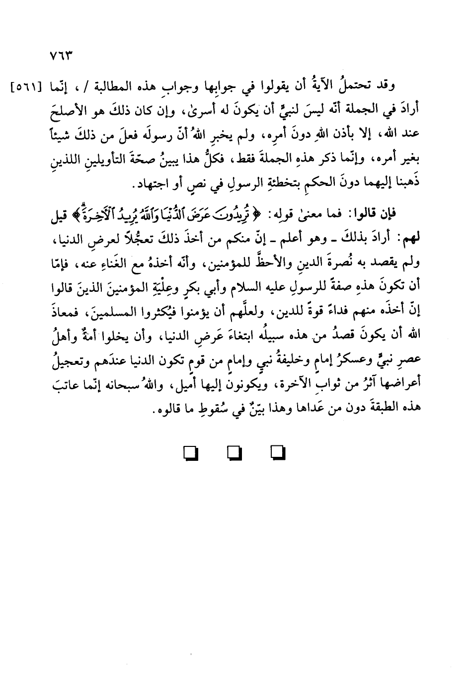 قيل لهم: أرادَ بذلكَ - وهو أعلم - إن منكم من أخذَ ذلكَ تعجلاً لعرضِ الدنيا، ولم يقصد به نُصرةَ الدينِ والأحظَّ للمؤمنين، وأنه أخذهُ مع الغَناءِ عنه، فإما أن تكونَ هذهِ صفةً للرسولِ عليه السلام وأبي بكرٍ وعِلْيَةِ المؤمنينَ الذينَ قالوا إن أخذَه منهم فداءً قوةً للدين، ولعلهم أن يؤمنوا فيُكثروا المسلمينَ، فمعاذَ الله أن يكونَ قصدُ من هذه سبيلُه ابتغاءَ عَرضِ الدنيا، وأن يخلوا أمة وأهلُ عصرِ نبي وعسكرُ إمامٍ وخليفةُ نبيٍّ وإمامٍ من قومٍ تكون الدنيا عندَهم وتعجيلُ أعراضها آثرُ من ثوابِ الآخرة، ويكونون إليها أميل، واللهُ سبحانه إنما عاتبَ هذه الطبقةَ دون من عَداها وهذا بيِّنٌ في سُقوطِ ما قالوه.