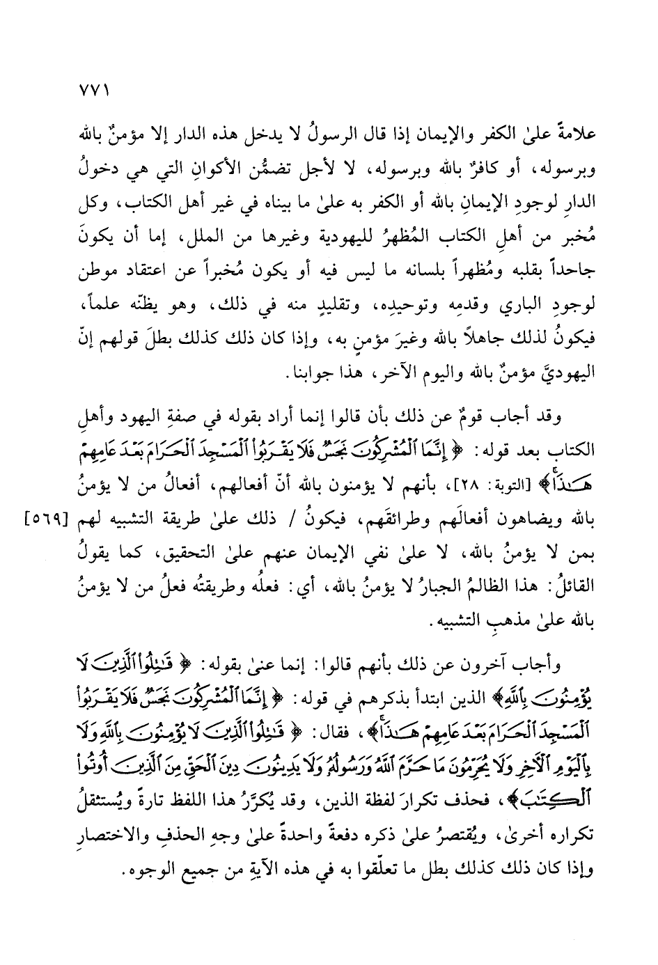 وأجاب آخرون عن ذلك بأنهم قالوا: إنما عنى بقوله: (قَاتِلُوا الَّذِينَ لَا يُؤْمِنُونَ بِاللَّهِ) الذين ابتدأ بذكرهم في قوله: (إِنَّمَا الْمُشْرِكُونَ نَجَسٌ فَلَا يَقْرَبُوا الْمَسْجِدَ الْحَرَامَ بَعْدَ عَامِهِمْ هَذَا) ، فقال: (قَاتِلُوا الَّذِينَ لَا يُؤْمِنُونَ بِاللَّهِ وَلَا بِالْيَوْمِ الْآخِرِ وَلَا يُحَرِّمُونَ مَا حَرَّمَ اللَّهُ وَرَسُولُهُ وَلَا يَدِينُونَ دِينَ الْحَقِّ مِنَ الَّذِينَ أُوتُوا الْكِتَابَ) ، فحذف تكرارَ لفظة الذين، وقد يُكرَّرُ هذا اللفظ تارةً ويُستثقلُ تكراره أخرى، ويُقتصرُ على ذكره دفعةً واحدةً على وجهِ الحذفِ والاختصارِ.