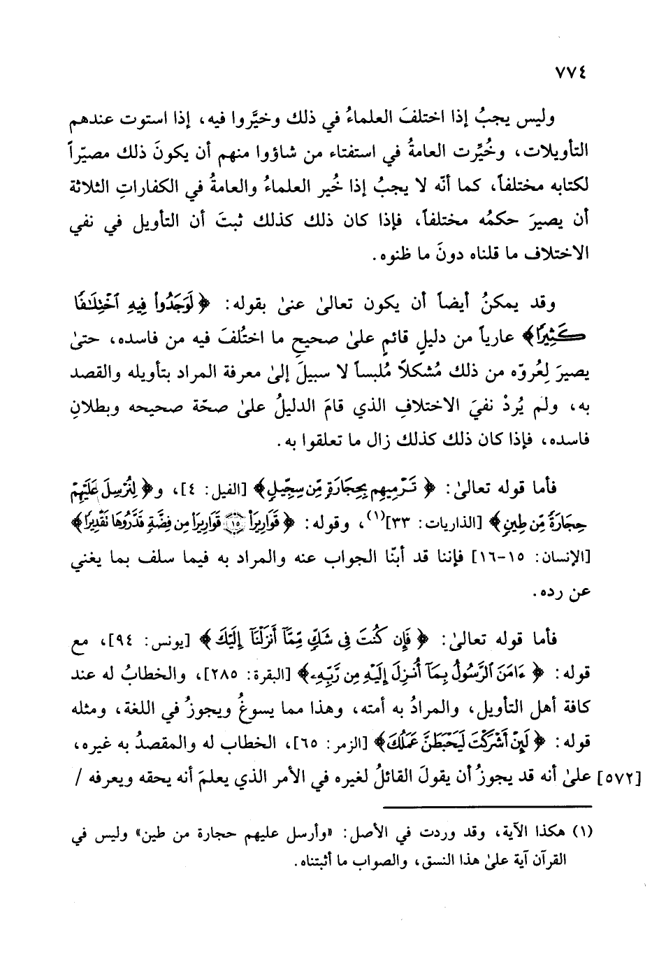 فأمَّا قوله تعالى: (فَإِنْ كُنْتَ فِي شَكٍّ مِمَّا أَنْزَلْنَا إِلَيْكَ فَاسْأَلِ الَّذِينَ يَقْرَءُونَ الْكِتَابَ مِنْ قَبْلِكَ) ، مع قوله: (آمَنَ الرَّسُولُ بِمَا أُنْزِلَ إِلَيْهِ مِنْ رَبِّهِ وَالْمُؤْمِنُونَ) ، والخطابُ له عند كافة أهل التأويل، والمرادُ به أمته، وهذا مما يسوغُ ويجوزُ في اللغة، ومثله قوله: (لَئِنْ أَشْرَكْتَ لَيَحْبَطَنَّ عَمَلُكَ) ، الخطاب له والمقصودُ به غيره، على أنه قد يجوزُ أن يقولَ القائلُ لغيره في الأمر الذي يعلمَ أنه يحقه ويعرفه
