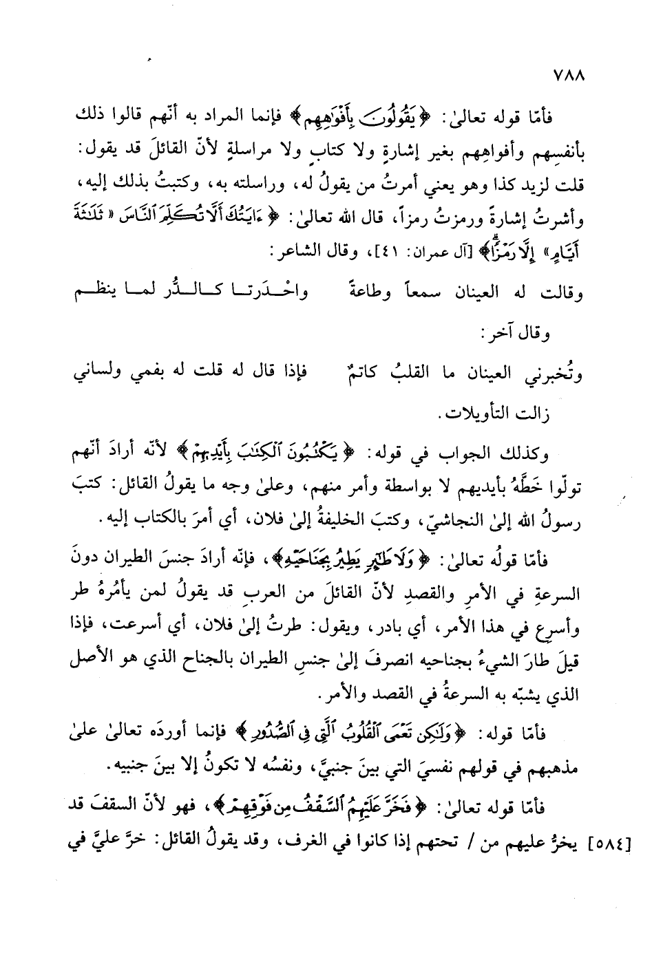 فأمَّا قوله تعالى: (يَقُولُونَ بِأَفْوَاهِهِمْ مَا لَيْسَ فِي قُلُوبِهِمْ) فإنما المراد به أنهم قالوا ذلك بأنفسِهم وأفواهِهم بغير إشارةٍ ولا كتابِ ولا مراسلةٍ لأن القائلَ قد يقول: قلت لزيد كذا وهو يعني أمرتُ من يقولُ له، وراسلته به، وكتبتُ بذلك إليه، وأشرتُ إشارة ورمزتُ رمزا، قال الله تعالى: (آيَتُكَ أَلَّا تُكَلِّمَ النَّاسَ ثَلَاثَةَ أَيَّامٍ إِلَّا رَمْزًا) .