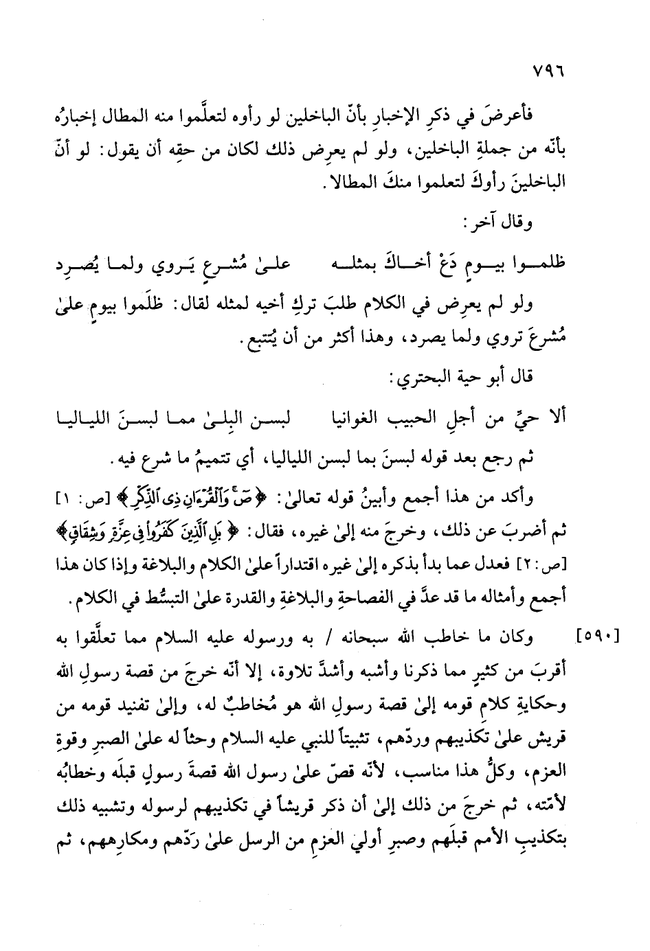 ثم أضربَ عن ذلك، وخرجَ منه إلى غيره، فقال: (بَلِ الَّذِينَ كَفَرُوا فِي عِزَّةٍ وَشِقَاقٍ) ، فعدل عما بدأ بذكره إلى غيره اقتداراً على الكلام والبلاغة وإذا كان هذا أجمع وأمثاله ما قد بيَّنَّاه في الفصاحةِ والبلاغةِ والقدرة على التبسُّط في الكلام.