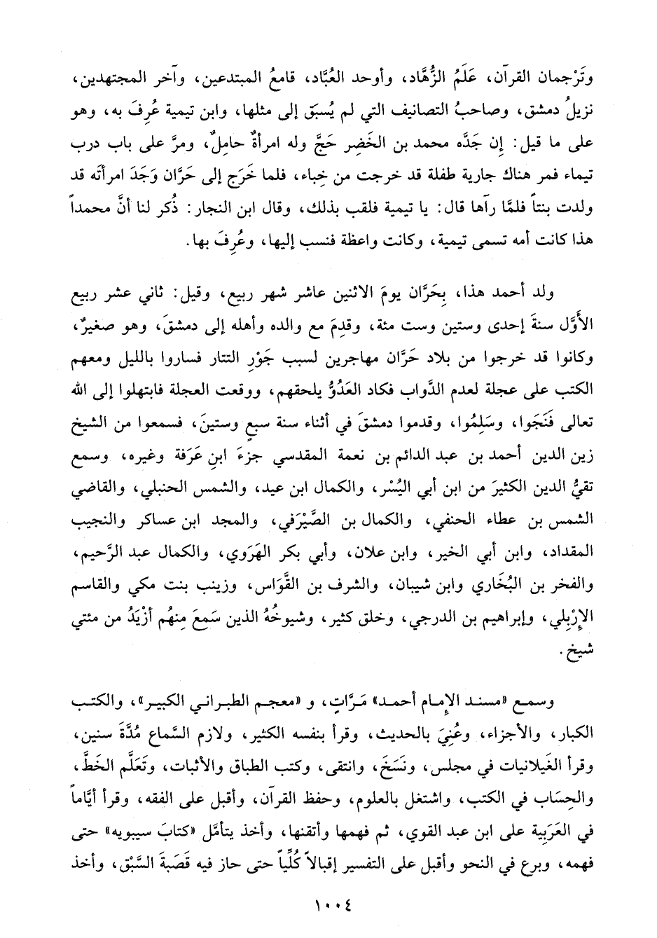 وتَرْجمان القرآن، عَلَمُ الزُّهَّاد، وأوحد العُبَّاد، قامعُ المبتدعين، وآخر المجتهدين، نزيلُ دمشق، وصاحبُ التصانيف التي لم يُسبَق إلى مثلها، وابن تيمية عُرِفَ به، وهو على ما قيل: إِن جَدَّه محمد بن الخَضِر حَجَّ وله امرأةٌ حامِلٌ، ومرَّ على باب درب تيماء فمر هناك جارية طفلة قد خرجت من خِباء، فلما خَرَج إلى حَرَّان وَجَدَ امرأتَه قد ولدت بنتًا فلمَّا رآها قال: يا تيمية فلقب بذلك، وقال ابن النجار: ذُكر لنا أنَّ محمدًا هذا كانت أمه تسمى تيمية، وكانت واعظة فنسب إليها، وعُرِفَ بها.