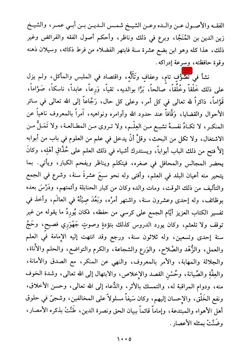 نشأ في تَصَوُّفٍ تامٍ، وعفافٍ وتَأَلُّهٍ، واقتصاد في الملبس والمأكل، ولم يزل على ذلك خَلْقًا وخُلُقًا، صالحًا، بَرًّا بوالديه، تقيًا، وَرِعًا، عابدًا، ناسكًا، صَوَّامًا، قَوَّامًا، ذاكرًا لله تعالى في كل أمر، وعلى كل حال، رَجَّاعًا إلى الله تعالى في سائر الأحوال والقضايا، وَقَّافًا عند حدود الله وأوامره ونواهيه، آمرًا بالمعروف ناهيًا عن المنكر، لا تكادُ نفسهُ تشبع من العِلْم، ولا تروى من المطالعة، ولا تَمَلُّ من الاشتغال، ولا تكل من البحث، وقلَّ أنْ يدخل في علم من العلوم في باب من أبوابه إلَّا فتح من ذلك الباب أبوابًا، ويستدرك أشياء في ذلك العلم على حُذَّاقِ أهْلِه، وكانَ يحضر المجالس والمحافل في صغره، فيتكلم ويناظر ويفحم الكبار، ويأتي. بما يتحير منه أعيان البلد في العلم، وأفتى وله نحو سبعَ عشرةَ سنة، وشرع في الجمع والتأليف من ذلك الوقت، ومات والده وكان من كبار الحنابلة وأئمتهم، ودَرَّسَ بعده بوظائف، وله إحدى وعشرون سنة، واشتهر أمرُه، وبَعُدَ صِيْتُهُ في العالَم، وأخذ في تفسير الكتاب العزيز أيَّام الجمع على كرسي من حفظه، فكان يُورِدُ ما يقوله من غير توقف ولا تلعثم، وكان يورد الدروس كذلك بتؤدةٍ وصوتٍ جَهْوَرِي فصيحٍ، وحَجَّ سنة إحدى وتسعين، وله ثلاثون سنة، ورجع وقد انتهت إليه الإِمامة في العلم والعمل، والزُّهْد والصَّلاح، والوَرع والشجاعة، والكرم والتواضع، والحلم والأَناة، والجلالة والمهابة، والأمر بالمعروف، والنهي عن المنكر، مع الصدق والأمانة، والعِفَّةِ والصِّيانة، وحُسْنِ القصد والإِخلاص، والابتهال إلى الله تعالى، وشدة الخوف منه، ودوام المراقبة له، والتمسك بالأثر، والدُّعاء إلى الله تعالى، وحسن الأخلاق، ونفع الخَلْق، والإِحسان إليهم، وكان سَيفًا مسلولًا على المخالفين، وشجىً في حلوق أهل الأهواء والمبتدعة، وإمامًا قائمًا ببيان الحق ونصرة الدين، طَنَّتْ بذكره الأمصار، وضَنَّتْ بمثله الأعصار.