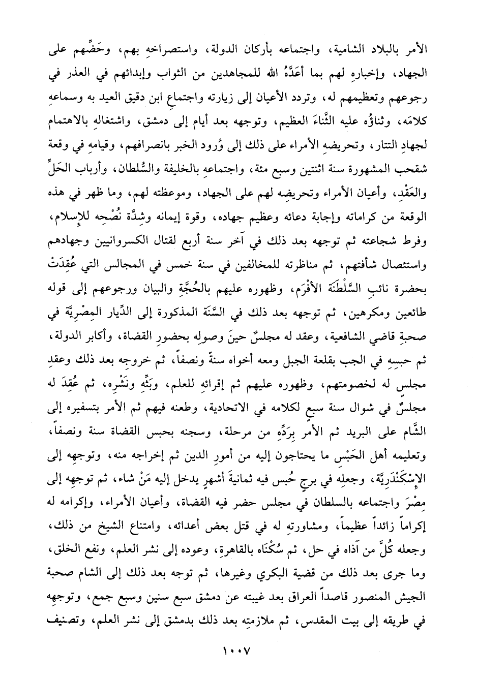 الأمر بالبلاد الشامية، واجتماعه بأركان الدولة، واستصراخهِ بهم، وحَضَّهم على الجهاد، وإخبارهِ لهم بما أعَدَّهُ الله للمجاهدين من الثواب وإبدائهم في العذر في رجوعهم وتعظيمهم له، وتردد الأعيان إلى زيارته واجتماعِ ابن دقيق العيد به وسماعهِ كلامَه، وثناؤُه عليه الثَّناءَ العظيم، وتوجهه بعد أيام إلى دمشق، واشتغالهِ بالاهتمام لجهادِ التتار، وتحريضهِ الأمراء على ذلك إلى وُرود الخبر بانصرافهم، وقيامهِ في وقعة شقحب المشهورة سنة اثنتين وسبع مئة، واجتماعهِ بالخليفة والسُّلطان، وأرباب الحَلِّ والعَقْدِ، وأعيان الأمراء وتحريضِه لهم على الجهاد، وموعظته لهم، وما ظهر في هذه الوقعة من كراماته وإجابة دعائه وعظيم جهاده، وقوة إيمانه وشِدَّة نُصْحِه للإِسلام، وفرط شجاعته ثم توجهه بعد ذلك في آخر سنة أربع لقتال الكسروانيين وجهادهم واستئصال شأفتهم، ثم مناظرته للمخالفين في سنة خمس في المجالس التي عُقِدَتْ بحضرة نائبِ السَّلْطَنَة الأفْرَم، وظهوره عليهم بالحُجَّةِ والبيان ورجوعهم إلى قوله طائعين ومكرهين، ثم توجهه بعد ذلك في السَّنَة المذكورة إلى الدِّيار المِصْرِيَّة في صحبةِ قاضي الشافعية، وعقد له مجلسٌ حينَ وصولِه بحضورِ القضاة، وأكابر الدولة، ثم حبسِهِ في الجب بقلعة الجبل ومعه أخواه سنةً ونصفًا، ثم خروجِه بعد ذلك وعقدِ مجلسٍ له لخصومتهم، وظهوره عليهم ثم إقرائهِ للعلم، وبَثَّهِ ونَشْرِه، ثم عُقِدَ له مجلسٌ في شوال سنة سبعٍ لكلامه في الاتحادية، وطعنه فيهم ثم الأمر بتسفيره إلى الشَّام على البريد ثم الأمر بِرَدِّهِ من مرحلة، وسجنه بحبس القضاة سنة ونصفًا، وتعليمه أهل الحَبْسِ ما يحتاجون إليه من أمورِ الدين ثم إخراجه منه، وتوجهِه إلى الإِسْكَنْدَريَّة، وجعلِه في برجِ حُبس فيه ثمانيةَ أشهرٍ يدخل إليه مَنْ شاء، ثم توجهِه إلى مِصْرَ واجتماعه بالسلطان في مجلس حضر فيه القضاة، وأعيان الأمراء، وإكرامه له إكرامًا زائدًا عظيمًا، ومشاورتهِ له في قتل بعض أعدائه، وامتناع الشيخ من ذلك، وجعله كُلَّ من آذاه في حل، ثم سُكْنَاه بالقاهرةِ، وعوده إلى نشر العلم، ونفع الخلق، وما جرى بعد ذلك من قضية البكري وغيرها، ثم توجه بعد ذلك إلى الشام صحبة الجيش المنصور قاصدًا العراق بعد غيبته عن دمشق سبع سنين وسبع جمع، وتوجهِه في طريقه إلى بيت المقدس، ثم ملازمتِه بعد ذلك بدمشق إلى نشر العلم، وتصنيف