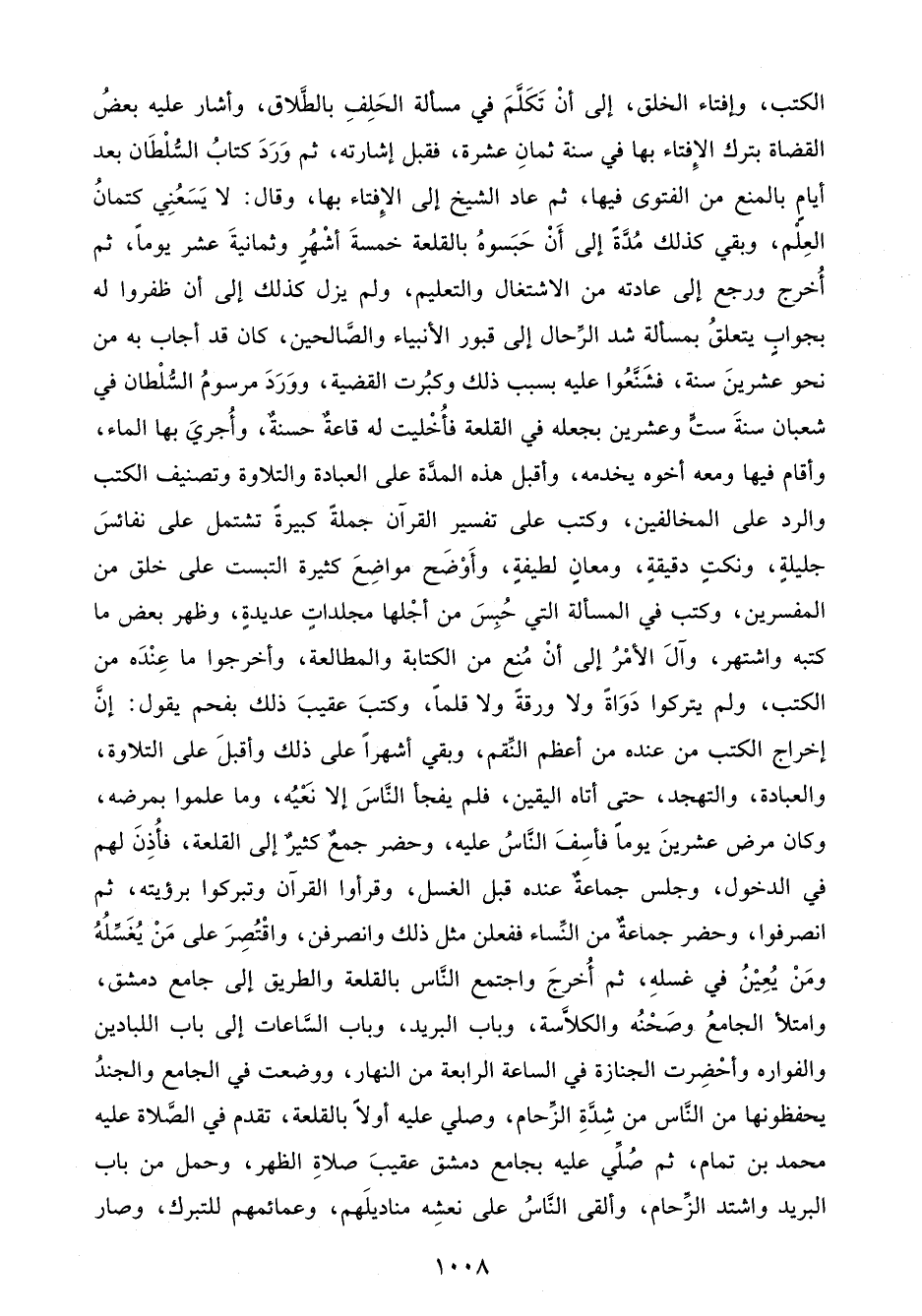 الكتب، وإفتاء الخلق، إلى أنْ تَكَلَّمَ في مسألة الحَلِفِ بالطَّلاق، وأشار عليه بعضُ القضاة بترك الإِفتاء بها في سنة ثمانِ عشرة، فقبل إشارته، ثم وَرَدَ كتابُ السُّلْطَان بعد أيامٍ بالمنع من الفتوى فيها، ثم عاد الشيخ إلى الإِفتاء بها، وقال: لا يَسَعُنِي كتمانُ العِلْم، وبقي كذلك مُدَّةً إلى أَنْ حَبَسوهُ بالقلعة خمسةَ أشْهُرٍ وثمانيةَ عشر يومًا، ثم أُخرج ورجع إلى عادته من الاشتغال والتعليم، ولم يزل كذلك إلى أن ظفروا له بجوابٍ يتعلقُ بمسألة شد الرَّحال إلى قبور الأنبياء والصَّالحين، كان قد أجاب به من نحو عشرينَ سنة، فشَنَّعُوا عليه بسبب ذلك وكبُرت القضية، ووَرَدَ مرسومُ السُّلْطان في شعبان سنةَ ستٍّ وعشرين بجعله في القلعة فأُخْليت له قاعةٌ حسنةٌ، وأُجريَ بها الماء، وأقام فيها ومعه أخوه يخدمه، وأقبل هذه المدَّة على العبادة والتلاوة وتصنيف الكتب والرد على المخالفين، وكتب على تفسير القرآن جملةً كبيرةً تشتمل على نفائسَ جليلةٍ، ونكتٍ دقيقةٍ، ومعانٍ لطيفةٍ، وأَوْضَح مواضِعَ كثيرة التبست على خلق من المفسرين، وكتب في المسألة التي حُبِسَ من أجْلها مجلداتٍ عديدةٍ، وظهر بعض ما كتبه واشتهر، وآلَ الأمرُ إلى أنْ مُنع من الكتابة والمطالعة، وأخرجوا ما عِنْدَه من الكتب، ولم يتركوا دَوَاةً ولا ورقةً ولا قلمًا، وكتبَ عقيبَ ذلك بفحم يقول: إنَّ إخراج الكتب من عنده من أعظم النِّقم، وبقي أشهرًا على ذلك وأقبلَ على التلاوة، والعبادة، والتهجد، حتى أتاه اليقين، فلم يفجأ النَّاسَ إلا نَعْيُه، وما علموا بمرضه، وكان مرض عشرينَ يومًا فأسِفَ النَّاسُ عليه، وحضر جمعٌ كثيرٌ إلى القلعة، فأُذِنَ لهم في الدخول، وجلس جماعةٌ عنده قبل الغسل، وقرأوا القرآن وتبركوا برؤيته، ثم انصرفوا، وحضر جماعةٌ من النِّساء ففعلن مثل ذلك وانصرفن، واقْتُصِرَ على مَنْ يُغَسِّلُهُ ومَنْ يُعِيْنُ في غسلهِ، ثم أُخرجَ واجتمع النَّاس بالقلعة والطريق إلى جامع دمشق، وامتلأ الجامعُ وصَحْنُه والكلَّاسة، وباب البريد، وباب السَّاعات إلى باب اللبادين والفواره وأحْضِرت الجنازة في الساعة الرابعة من النهار، ووضعت في الجامع والجندُ يحفظونها من النَّاس من شِدَّةِ الزِّحام، وصلي عليه أولًا بالقلعة، تقدم في الصَّلاة عليه محمد بن تمام، ثم صُلِّي عليه بجامع دمشق عقيبَ صلاةِ الظهر، وحمل من باب البريد واشتد الزِّحام، وألقى النَّاسُ على نعشِه مناديلَهم، وعمائمهم للتبرك، وصار