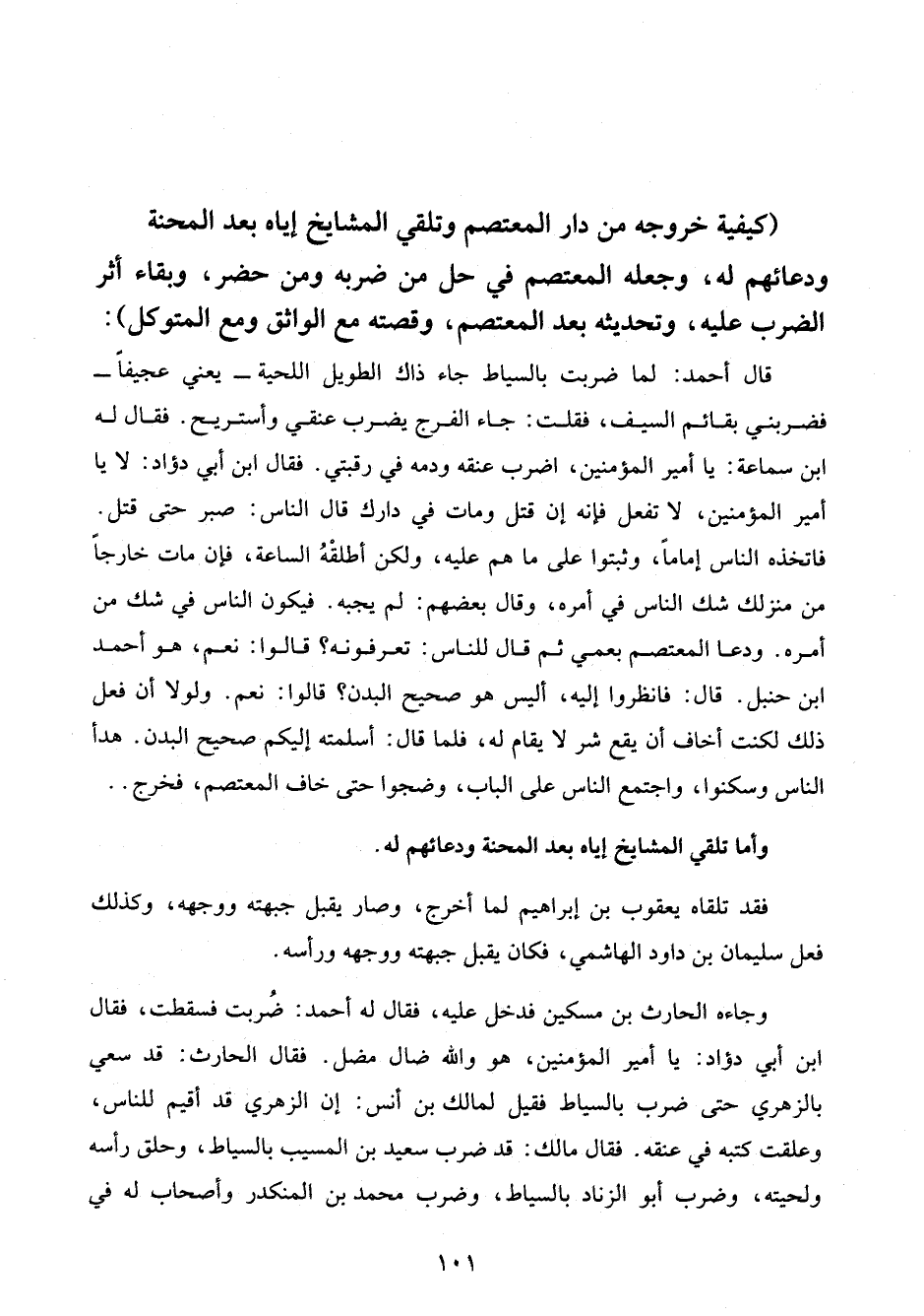 قال أحمد: لما ضربت بالسياط جاء ذاك الطويل اللحية - يعني عجيفًا - فضربني بقائم السيف، فقلت: جاء الفرج يضرب عنقي وأستريح. فقال له ابن سماعة: يا أمير المؤمنين، اضرب عنقه ودمه في رقبتي. فقال ابن أبي دؤاد: لا يا أمير المؤمنين، لا تفعل فإنه إن قتل ومات في دارك قال الناس: صبر حتى قتل. فاتخذه الناس إمامًا، وثبتوا على ما هم عليه، ولكن أطلقْهُ الساعة، فإن مات خارجًا من منزلك شك الناس في أمره، وقال بعضهم: لم يجبه. فيكون الناس في شك من أمره. ودعا المعتصم بعمي ثم قال للناس: تعرفونه؟ قالوا: نعم، هو أحمد ابن حنبل. قال: فانظروا إليه، أليس هو صحيح البدن؟ قالوا: نعم. ولولا أن فعل ذلك لكنت أخاف أن يقع شر لا يقام له، فلما قال: أسلمته إليكم صحيح البدن. هدأ الناس وسكنوا، واجتمع الناس على الباب، وضجوا حتى خاف المعتصم، فخرج ..