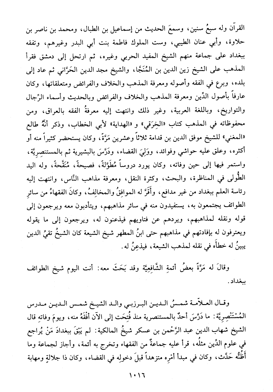 القرآن وله سبعُ سنين، وسمعَ الحديث من إسماعيل بن الطبال، ومحمد بن ناصر بن حلاوة، وأبي عنان الطيبي، وست الملوك فاطمة بنت أبي البدر وغيرهم، وتفقه ببغداد على جماعة منهم الشيخ المفيد الحربي وغيره، ثم ارتحل إلى دمشق فقرأ المذهب على الشيخ زين الدين بن المُنَجَّا، والشيخ مجد الدين الحَرَّاني ثم عاد إلى بلده، وبرع في الفقه وأصوله ومعرفة المذهب والخلاف والفرائض ومتعلقاتها، وكان عارفًا بأصول الدِّين ومعرفة المذهب والخلاف والفرائض وبالحديث وأسماء الرِّجال والتواريخ، وباللغة العربية، وغير ذلك وانتهت إليه معرفةُ الفقه بالعراق، ومن محفوظاته في المذهب كتاب "الخِرَقي" و"الهداية" لأبي الخطاب، وذكر أنَّهُ طالع "المغني" للشيخ موفق الدين بن قدامة ثلاثًا وعشرين مَرَّةً، وكان يستحضر كثيرًا منه أو أكثره، وعلق عليه حواشي وفوائد، ووَلِيَ القضاء، ودَرَّسَ بالبشيرية ثم بالمستنصِريَّة، واستمر فيها إلى حين وفاته، وكان يورد دروسًا مُطَوَّلةً، فصيحةً، مُنَقَّحةً، وله اليد الطُّولى في المناظرة، والبحث، وكثرة النقل، ومعرفة مذاهب النَّاس، وانتهت إليه رئاسة العلم ببغداد من غير مدافع، وأَقَرَّ له الموافِقُ والمخالِفُ، وكانَ الفقهاءُ من سائرِ الطوائف يجتمعون به، يستفيدون منه في سائر مذاهبهم، ويتأدبون معه ويرجعون إلى قوله ونقله لمذاهبهم، ويردهم عن فتاويهم فيذعنون له، ويرجعون إلى ما يقوله ويعترفون له بإفادتهم في مذاهبهم حتى ابنُ المطهر شيخ الشيعة كان الشيخُ تقيُ الدين يبينُ له خطأَه في نقله لمذهب الشيعة، فيذعِنُ له.
