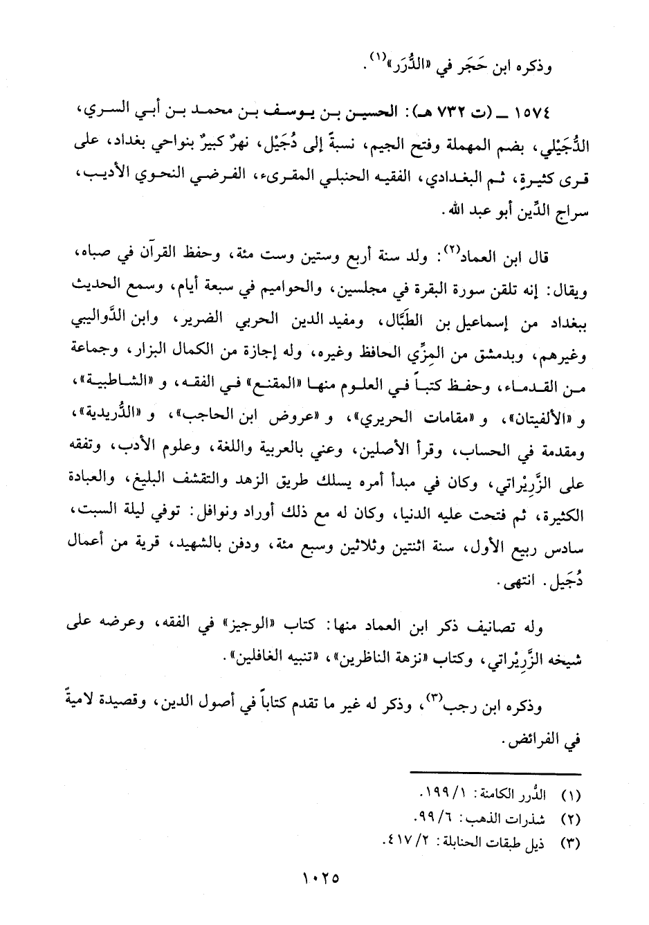 1574 - (ت 732 هـ): الحسين بن يوسف بن محمد بن أبي السري، الدُّجَيْلي، بضم المهملة وفتح الجيم، نسبةً إلى دُجَيْل، نهرٌ كبيرٌ بنواحي بغداد، على قرى كثيرةٍ، ثم البغدادي، الفقيه الحنبلي المقرئ، الفرضي النحوي الأديب، سراج الدِّين أبو عبد الله.