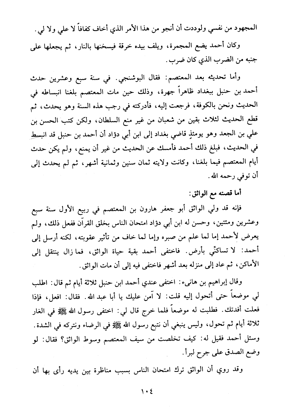 فإنه قد ولي الواثق أبو جعفر هارون بن المعتصم في ربيع الأول سنة سبع وعشرين ومئتين، وحسن له ابن أبي دؤاد امتحان الناس بخلق القرآن ففعل ذلك، ولم يعرض لأحمد إما لما علم من صبره وإما لما خاف من تأثير عقوبته، لكنه أرسل إلى أحمد: لا تساكنِّي بأرض. فاختفى أحمد بقية حياة الواثق، فما زال ينتقل إلى الأماكن، ثم عاد إلى منزله بعد أشهر فاختفى فيه إلى أن مات الواثق.