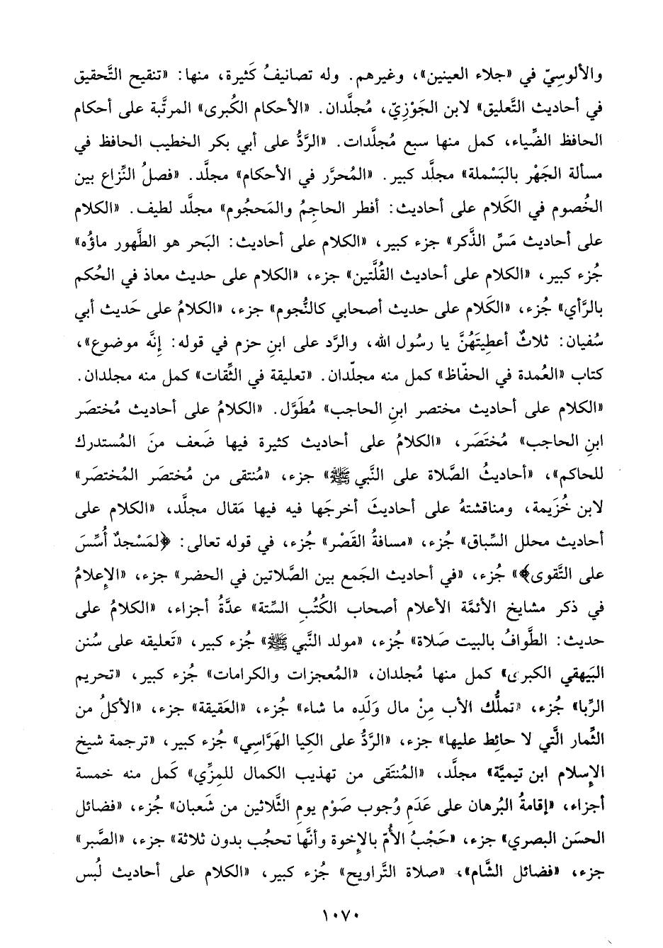 والألوسِيّ في "جلاء العينين"، وغيرهم. وله تصانيفُ كَثيرة، منها: "تنقيح التَّحقيق في أحاديث التَّعليق" لابن الجَوْزِيّ، مُجلَّدان. "الأحكام الكُبرى" المرتَّبة على أحكام الحافظ الضَّياء، كمل منها سبع مُجلَّدات. "الرَّدُّ على أبي بكر الخطيب الحافظ في مسألة الجَهْر بالبَسْملة" مجلَّد كبير. "المُحرَّر في الأحكام" مجلَّد. "فصلُ النِّزاع بين الخُصوم في الكَلام على أحاديث: أفطر الحاجِمُ والمَحجُوم" مجلَّد لطيف. "الكلام على أحاديث مَسِّ الذَّكر" جزء كبير، "الكلام على أحاديث: البَحر هو الطَّهور ماؤُه" جُزء كبير، "الكلام على أحاديث القُلَّتين" جزء، "الكلام على حديث معاذ في الحُكم بالرَّأي" جُزء، "الكَلام على حديث أصحابي كالنُّجوم" جزء، "الكلامُ على حَديث أبي سُفيان: ثلاثٌ أعطِيتَهُنَّ يا رسُول الله، والرَّد على ابنِ حزم في قوله: إِنَّه موضوع"، كتاب "العُمدة في الحفّاظ" كمل منه مجلّدان. "تعليقة في الثِّقات" كمل منه مجلدان. "الكلام على أحاديث مختصر ابنِ الحاجب" مُطَوَّل. "الكلامُ على أحاديث مُختصَر ابنِ الحاجب" مُختَصَر، "الكلامُ على أحاديث كثيرة فيها ضَعف منَ المُستدرك للحاكم"، "أحاديثُ الصَّلاة على النَّبي - صلى الله عليه وسلم -" جزء، "مُنتقى من مُختصَر المُختصَر" لابن خُزَيمة، ومناقشتهُ على أحاديثَ أخرجَها فيه فيها مَقال مجلَّد، "الكلام على أحاديث محلل السِّباق" جُزء، "مسافةُ القَصْر" جُزء، في قوله تعالى: {لَمَسْجِدٌ أُسِّسَ عَلَى التَّقْوَى} " جُزء، "في أحاديث الجَمع بين الصَّلاتين في الحضر" جزء، "الإِعلامُ في ذكر مشايخ الأئمَّة الأعلام أصحاب الكُتُبِ السِّتة" عدَّةُ أجزاء، "الكلامُ على حديث: الطَّوافُ بالبيت صَلاة" جُزء، "مولد النَّبي - صلى الله عليه وسلم -" جُزء كبير، "تَعليقه على سُنن البَيهقي الكبرى" كمل منها مُجلدان، "المُعجزات والكرامات" جُزء كبير، "تحريم الرِّبا" جُزء، "تملُّك الأب مِنْ مال وَلَدِه ما شاء" جُزء، "العَقيقة" جزء، "الأكلُ من الثِّمار الَّتي لا حائِط عليها" جزء، "الرَّدُّ على الكِيا الهَرَّاسِي" جُزء كبير، "ترجمة شيخ الإِسلام ابن تيميَّة" مجلَّد، "المُنتَقى من تهذيب الكمال للمِزِّي" كَمل منه خمسة أجزاء، "إقامةُ البُرهان على عَدَمِ وُجوب صَوْم يومِ الثَّلاثين من شَعبان" جُزء، "فضائل الحسَن البصري" جزء، "حَجْبُ الأُمّ بالإِخوة وأنَّها تحجُب بدون ثلاثة" جزء، "الصَّبر" جزء, "فضائل الشَّام", "صلاة التَّراويح" جُزء كبير، "الكلام على أحاديث لُبس