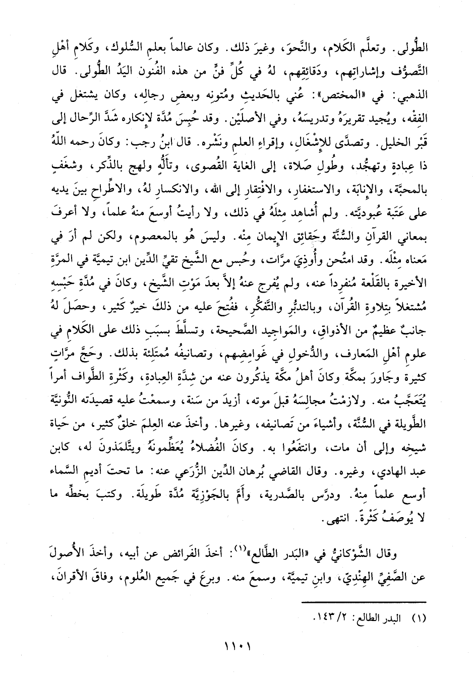وقال الشَّوْكانيُّ في "البَدر الطَّالع" (¬1): أَخَذَ الفَرائض عن أَبيه، وأخذَ الأُصولَ عن الصَّفِيَّ الهِنْدِيّ، وابنِ تيميَّة، وسمعَ منه. وبرعَ في جَميع العُلوم، وفاقَ الأقرانَ،