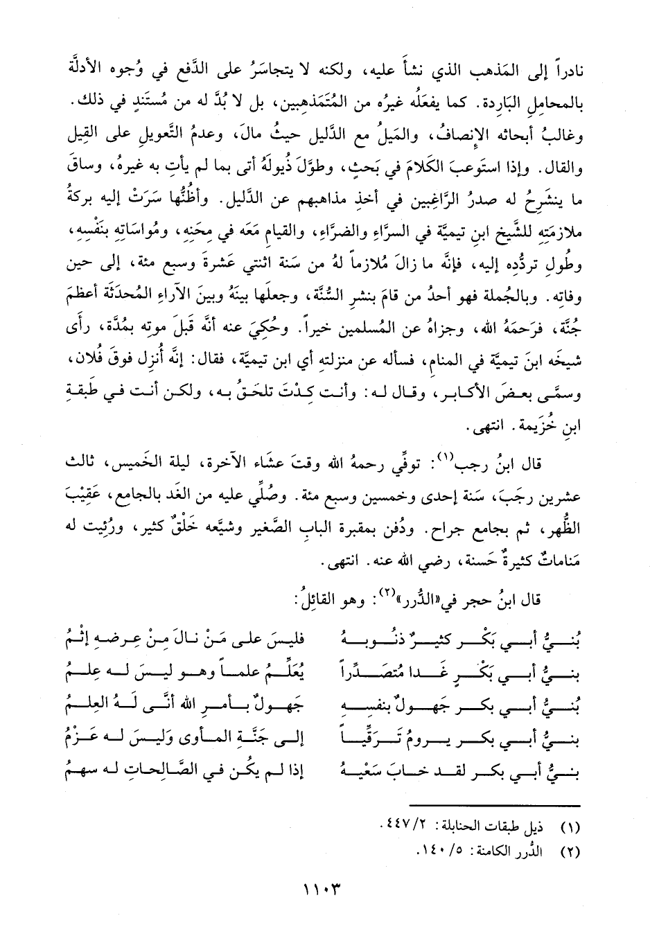 نادرًا إلى المَذهب الذي نشأَ عليه، ولكنه لا يتجاسَرُ على الدَّفع في وُجوه الأدلَّة بالمحامِلِ البَارِدة. كما يفعَلُه غيرُه من المُتَمَذهِبين، بل لا بُدَّ له من مُستَندٍ في ذلك. وغالبُ أبحاثه الإِنصافُ، والمَيلُ مع الدَّليل حيثُ مالَ، وعدمُ التَّعويلِ على القِيل والقال. وإذا استَوعبَ الكَلامَ في بَحثٍ، وطوَّلَ ذُيولَهُ أتى بما لم يأتِ به غيرهُ، وساقَ ما ينشَرِحُ له صدر الرَّاغِبين في أخذِ مذاهبهم عن الدَّليل. وأظُنُّها سَرَتْ إليه بركةُ ملازمَتِهِ للشَّيخ ابنِ تيميَّة في السرَّاءِ والضرَّاءِ، والقيامِ مَعَه في مِحَنِهِ، ومُواسَاتِهِ بنَفْسِهِ، وطُولِ تردُّدِه إليه، فإنَّه ما زالَ مُلازمًا لهُ من سَنة اثنتي عَشرةَ وسبع مئة، إلى حين وفاتِه. وبالجُملة فهو أحدُ من قامَ بنشرِ السُّنَّة، وجعلَها بينَهُ وبينَ الآراءِ المُحدَثَة أعظمَ جُنَّة، فرَحمَهُ الله، وجزاهُ عن المُسلمين خيرًا. وحُكِيَ عنه أنَّه قَبلَ موتِه بمُدَّة، رأَى شيخَه ابنَ تيميَّة في المنامِ، فسأله عن منزلتهِ أي ابن تيميَّة، فقال: إنَّه أُنزِل فوقَ فُلان، وسمَّى بعضَ الأكابر، وقال له: وأنت كِدْتَ تلحَقُ به، ولكن أنت في طَبقةِ ابنِ خُزَيمة. انتهى.