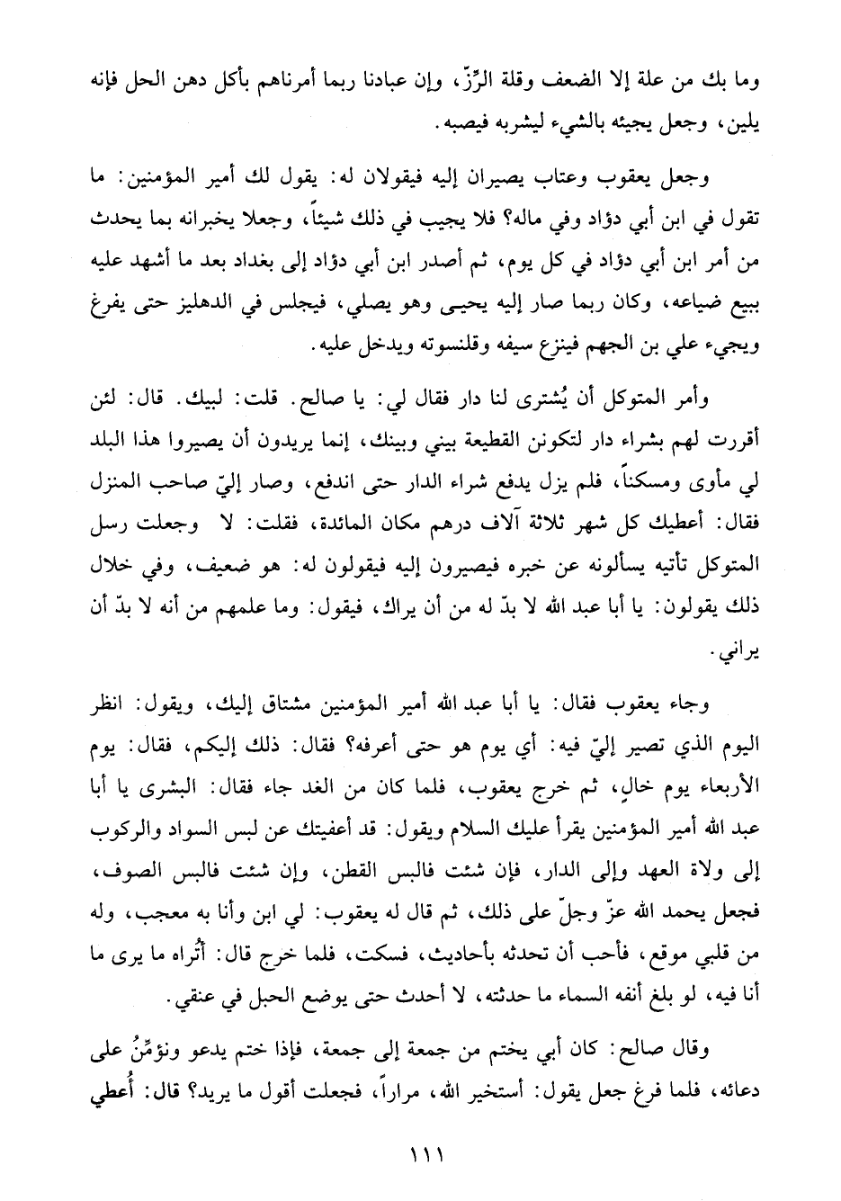وجاء يعقوب فقال: يا أبا عبد الله أمير المؤمنين مشتاق إليك، ويقول: انظر اليوم الذي تصير إليّ فيه: أي يوم هو حتى أعرفه؟ فقال: ذلك إليكم، فقال: يوم الأربعاء يوم خالٍ، ثم خرج يعقوب، فلما كان من الغد جاء فقال: البشرى يا أبا عبد الله أمير المؤمنين يقرأ عليك السلام ويقول: قد أعفيتك عن لبس السواد والركوب إلى ولاة العهد وإلى الدار، فإن شئت فالبس القطن، وإن شئت فالبس الصوف، فجعل يحمد الله عزّ وجلّ على ذلك، ثم قال له يعقوب: لي ابن وأنا به معجب، وله من قلبي موقع، فأحب أن تحدثه بأحاديث، فسكت، فلما خرج قال: أتُراه ما يرى ما أنا فيه، لو بلغ أنفه السماء ما حدثته، لا أحدث حتى يوضع الحبل في عنقي.