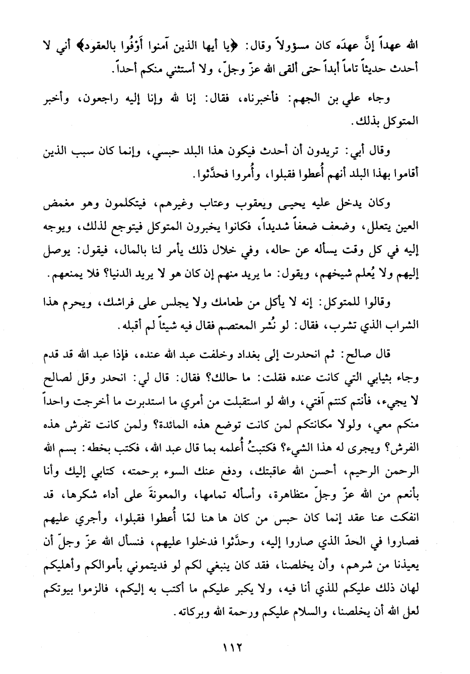 قال صالح: ثم انحدرت إلى بغداد وخلفت عبد الله عنده، فإذا عبد الله قد قدم وجاء بثيابي التي كانت عنده فقلت: ما حالك؟ فقال: قال لي: انحدر وقل لصالح لا يجيء، فأنتم كنتم آفتي، والله لو استقبلت من أمري ما استدبرت ما أخرجت واحدًا منكم معي، ولولا مكانتكم لمن كانت توضع هذه المائدة؟ ولمن كانت تفرش هذه الفرش؟ ويجرى له هذا الشيء؟ فكتبتُ أُعلمه بما قال عبد الله، فكتب بخطه: بِسْمِ اللَّهِ الرَّحْمَنِ الرَّحِيمِ، أحسن الله عاقبتك، ودفع عنك السوء برحمته، كتابي إليك وأنا بأنعم من الله عزّ وجلّ متظاهرة، وأسأله تمامها، والمعونةَ على أداء شكرها، قد انفكت عنا عقد إنما كان حبس من كان ها هنا لمّا أُعطوا فقبلوا، وأجري عليهم فصاروا في الحدّ الذي صاروا إليه، وحدَّثوا فدخلوا عليهم، فنسأل الله عزّ وجلّ أن يعيذنا من شرهم، وأن يخلصنا، فقد كان ينبغي لكم لو فديتموني بأموالكم وأهليكم لهان ذلك عليكم للذي أنا فيه، ولا يكبر عليكم ما أكتب به إليكم، فالزموا بيوتكم لعل الله أن يخلصنا، والسلام عليكم ورحمة الله وبركاته.