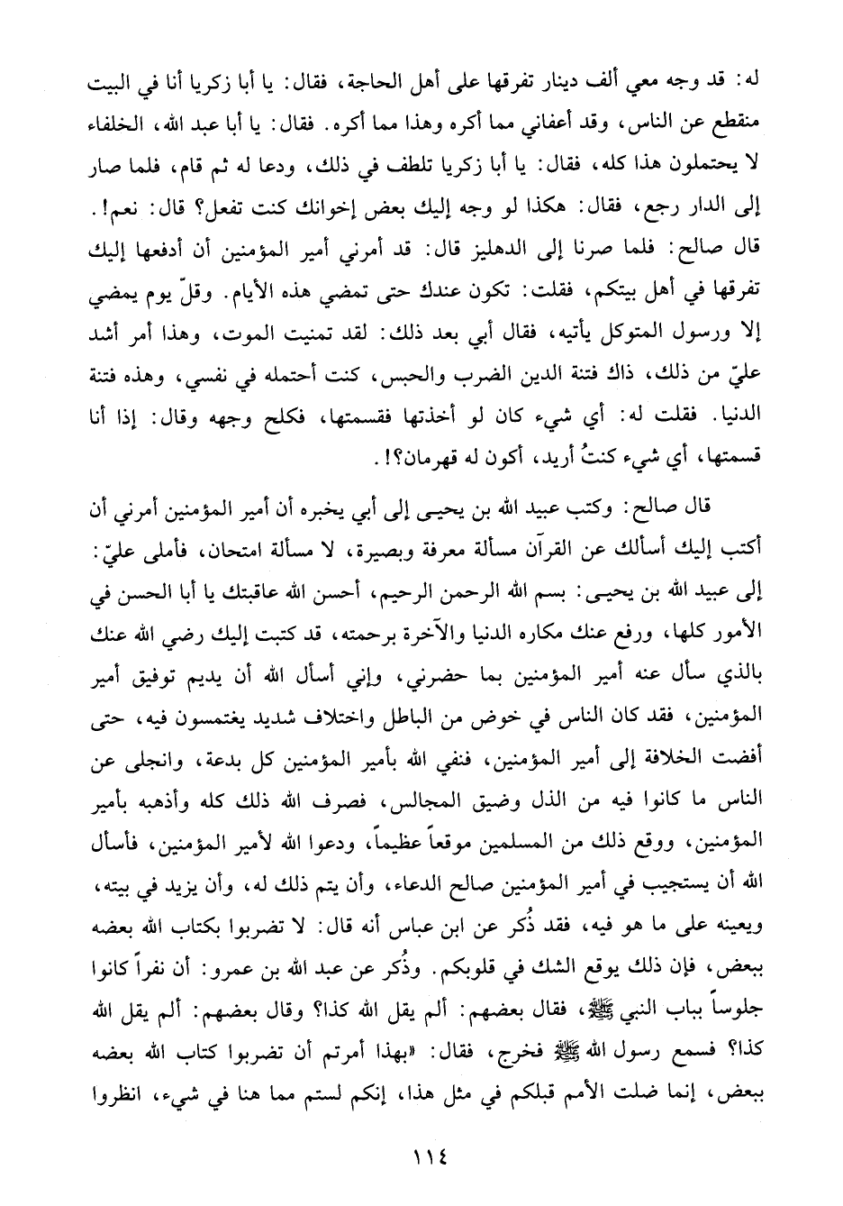 قال صالح: وكتب عبيد الله بن يحيى إلى أبي يخبره أن أمير المؤمنين أمرني أن أكتب إليك أسألك عن القرآن مسألة معرفة وبصيرة، لا مسألة امتحان، فأملى عليّ: إلى عبيد الله بن يحيى: بِسْمِ اللَّهِ الرَّحْمَنِ الرَّحِيمِ، أحسن الله عاقبتك يا أبا الحسن في الأمور كلها، ورفع عنك مكاره الدنيا والآخرة برحمته، قد كتبت إليك رضي الله عنك بالذي سأل عنه أمير المؤمنين بما حضرني، وإني أسأل الله أن يديم توفيق أمير المؤمنين، فقد كان الناس في خوض من الباطل واختلاف شديد يغتمسون فيه، حتى أفضت الخلافة إلى أمير المؤمنين، فنفي الله بأمير المؤمنين كل بدعة، وانجلى عن الناس ما كانوا فيه من الذل وضيق المجالس، فصرف الله ذلك كله وأذهبه بأمير المؤمنين، ووقع ذلك من المسلمين موقعًا عظيمًا، ودعوا الله لأمير المؤمنين، فأسأل الله أن يستجيب في أمير المؤمنين صالح الدعاء، وأن يتم ذلك له، وأن يزيد في بيته، ويعينه على ما هو فيه، فقد ذُكر عن ابن عباس أنه قال: لا تضربوا بكتاب الله بعضه ببعض، فإن ذلك يوقع الشك في قلوبكم. وذُكر عن عبد الله بن عمرو: أن نفرًا كانوا جلوسًا بباب النبي - صلى الله عليه وسلم -، فقال بعضهم: ألم يقل الله كذا؟ وقال بعضهم: ألم يقل الله كذا؟ فسمع رسول الله - صلى الله عليه وسلم - فخرج، فقال: "بهذا أمرتم أن تضربوا كتاب الله بعضه ببعض، إنما ضلت الأمم قبلكم في مثل هذا، إنكم لستم مما هنا في شيء، انظروا