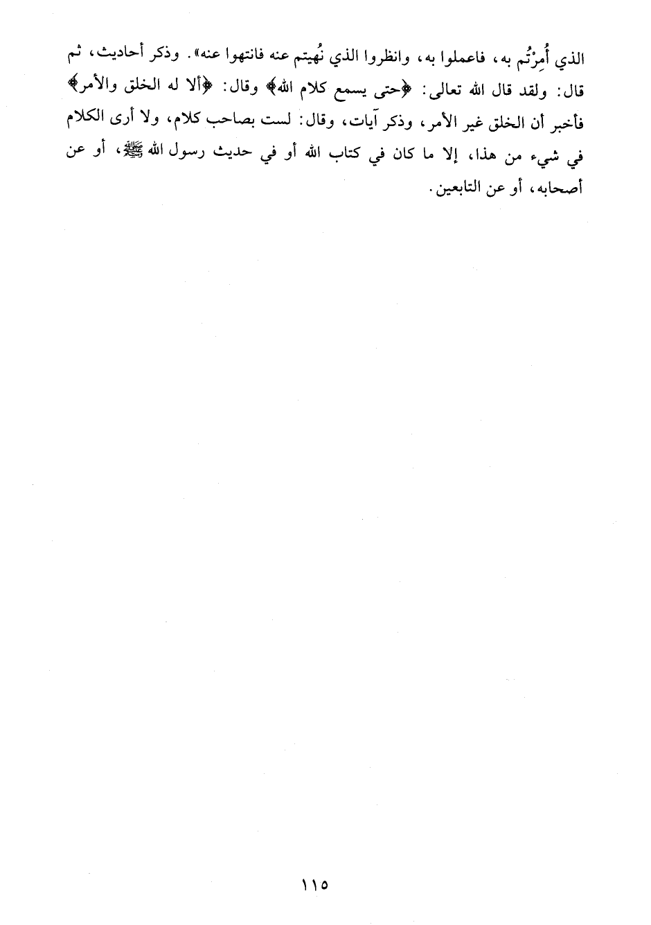 الذي أُمِرْتُم به، فاعملوا به، وانظروا الذي نُهيتم عنه فانتهوا عنه". وذكر أحاديث، ثم قال: ولقد قال الله تعالى: {حَتَّى يَسْمَعَ كَلَامَ اللَّهِ} وقال: {أَلَا لَهُ الْخَلْقُ وَالْأَمْرُ} فأخبر أن الخلق غير الأمر، وذكر آيات، وقال: لست بصاحب كلام، ولا أرى الكلام في شيء من هذا، إلا ما كان في كتاب الله أو في حديث رسول الله - صلى الله عليه وسلم -، أو عن أصحابه، أو عن التابعين.
