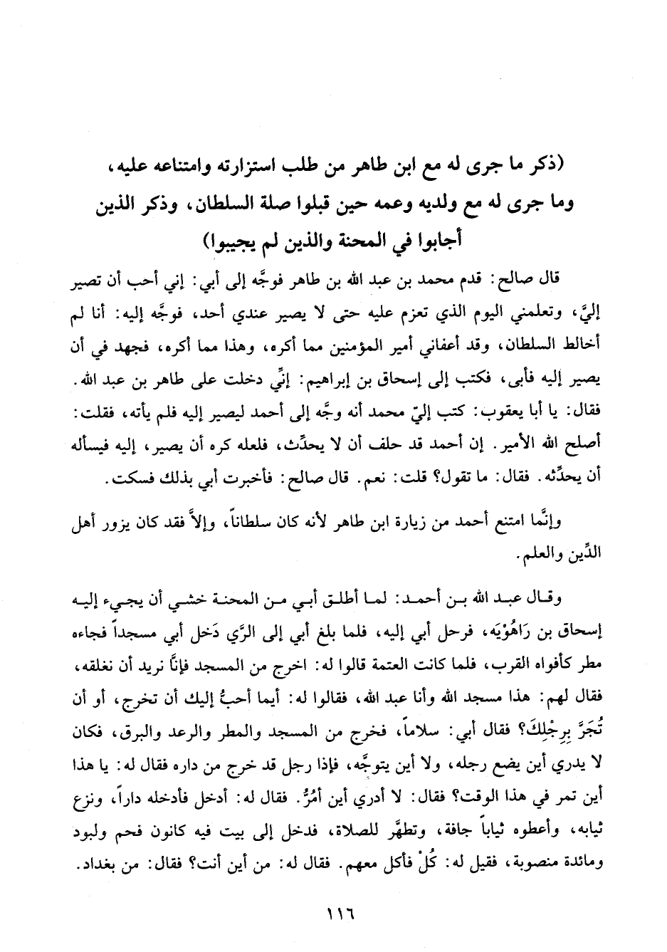 (ذكر ما جرى له مع ابن طاهر من طلب استزارته وامتناعه عليه، وما جرى له مع ولديه وعمه حين قبلوا صلة السلطان، وذكر الذين أجابوا في المحنة والذين لم يجيبوا)