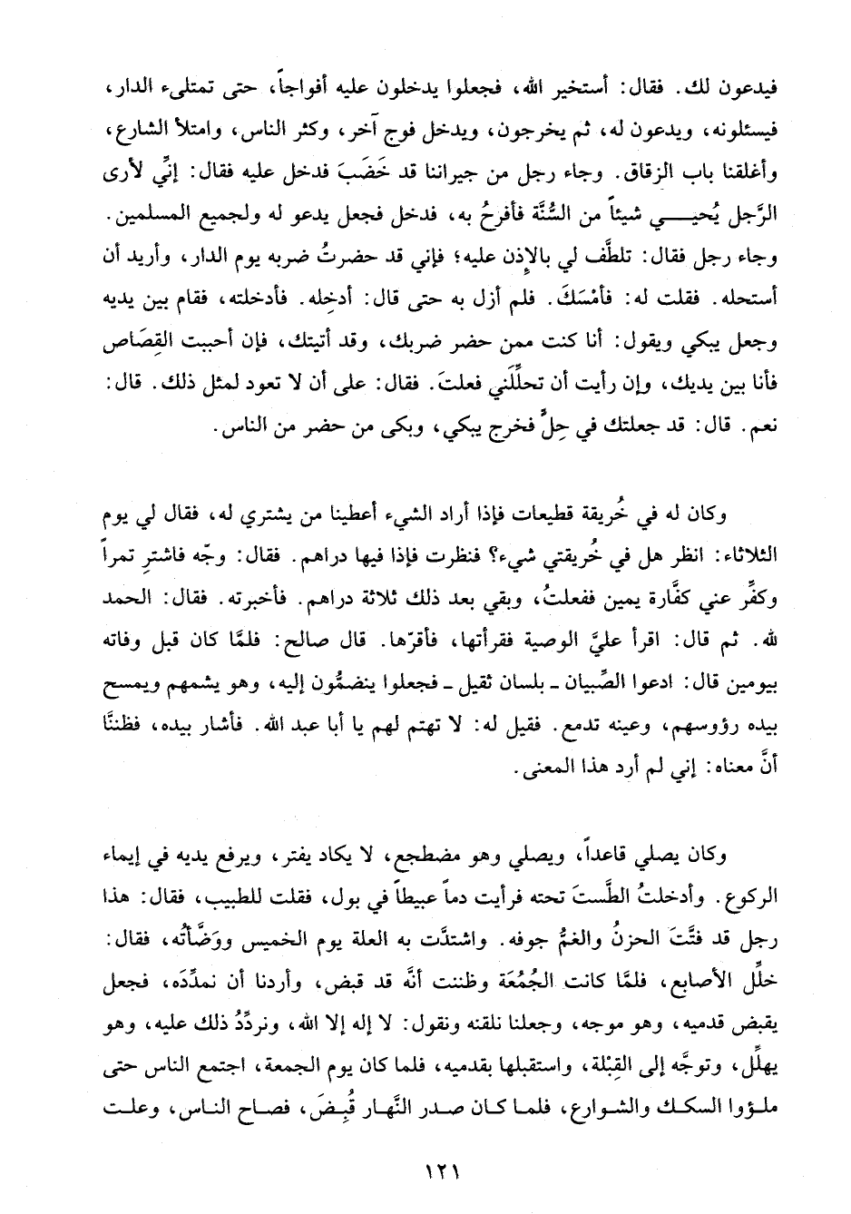 فيدعون لك. فقال: أستخير الله، فجعلوا يدخلون عليه أفواجًا، حتى تمتلئ الدار، فيسئلونه، ويدعون له، ثم يخرجون، ويدخل فوج آخر، وكثر الناس، وامتلأ الشارع، وأغلقنا باب الزقاق. وجاء رجل من جيراننا قد خَضَبَ فدخل عليه فقال: إنَّي لأرى الرَّجل يُحيي شيئًا من السُّنَّة فأفرحُ به، فدخل فجعل يدعو له ولجميع المسلمين. وجاء رجل فقال: تلطَّف لي بالإِذن عليه؛ فإني قد حضرتُ ضربه يوم الدار، وأريد أن أستحله. فقلت له: فأمْسَكَ. فلم أزل به حتى قال: أدخِله. فأدخلته، فقام بين يديه وجعل يبكي ويقول: أنا كنت ممن حضر ضربك، وقد أتيتك، فإن أحببت القِصَاص فأنا بين يديك، وإن رأيت أن تحلِّلَني فعلتَ. فقال: على أن لا تعود لمثل ذلك. قال: نعم. قال: قد جعلتك في حِلٍّ فخرج يبكي، وبكى من حضر من الناس.