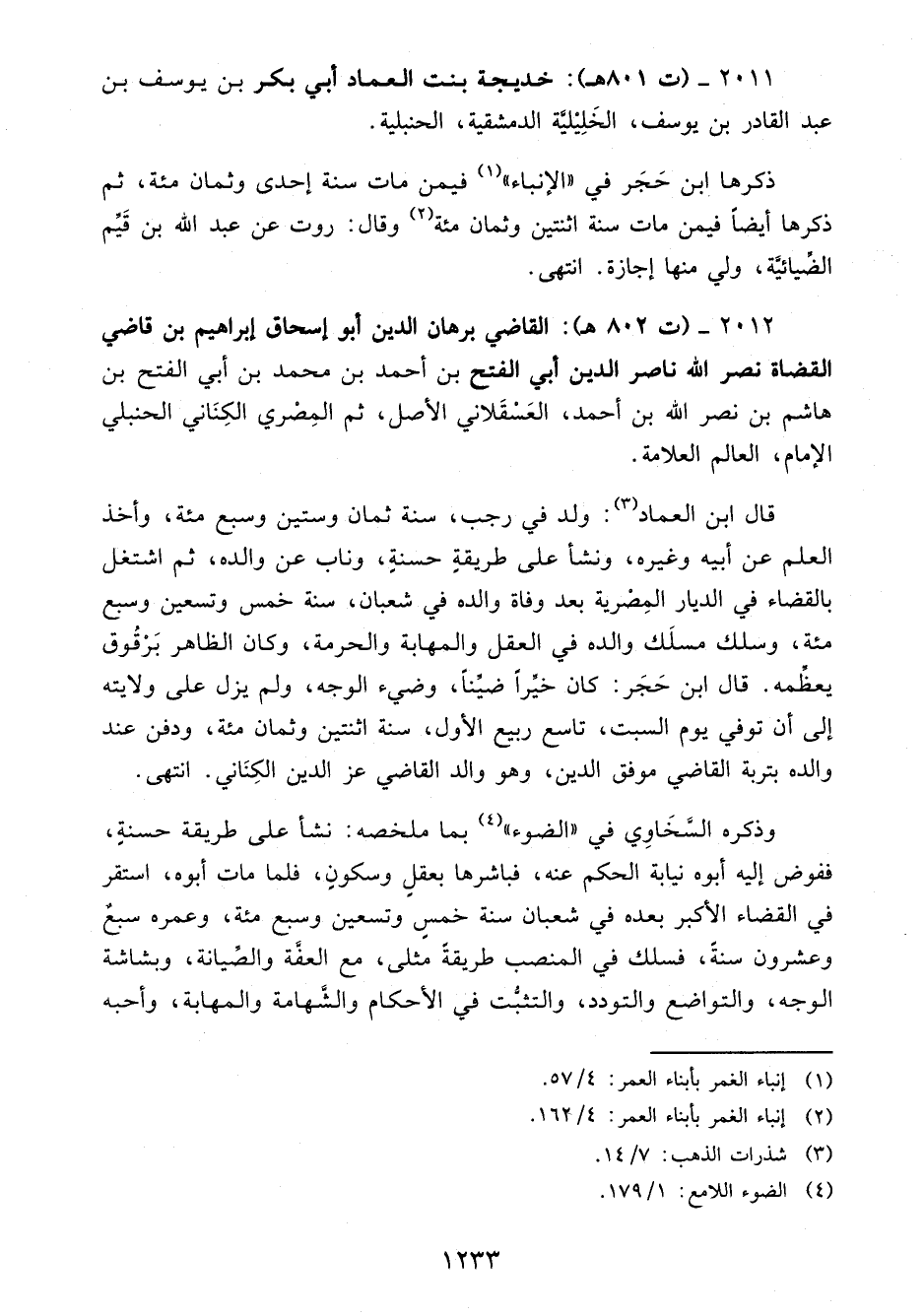 2012 - (ت 802 هـ): القاضي برهان الدين أبو إسحاق إبراهيم بن قاضي القضاة نصر الله ناصر الدين أبي الفتح بن أحمد بن محمد بن أبي الفتح بن هاشم بن نصر الله بن أحمد، العَسْقَلاني الأصل، ثم المِصْري الكِنَاني الحنبلي الإمام، العالم العلامة.
