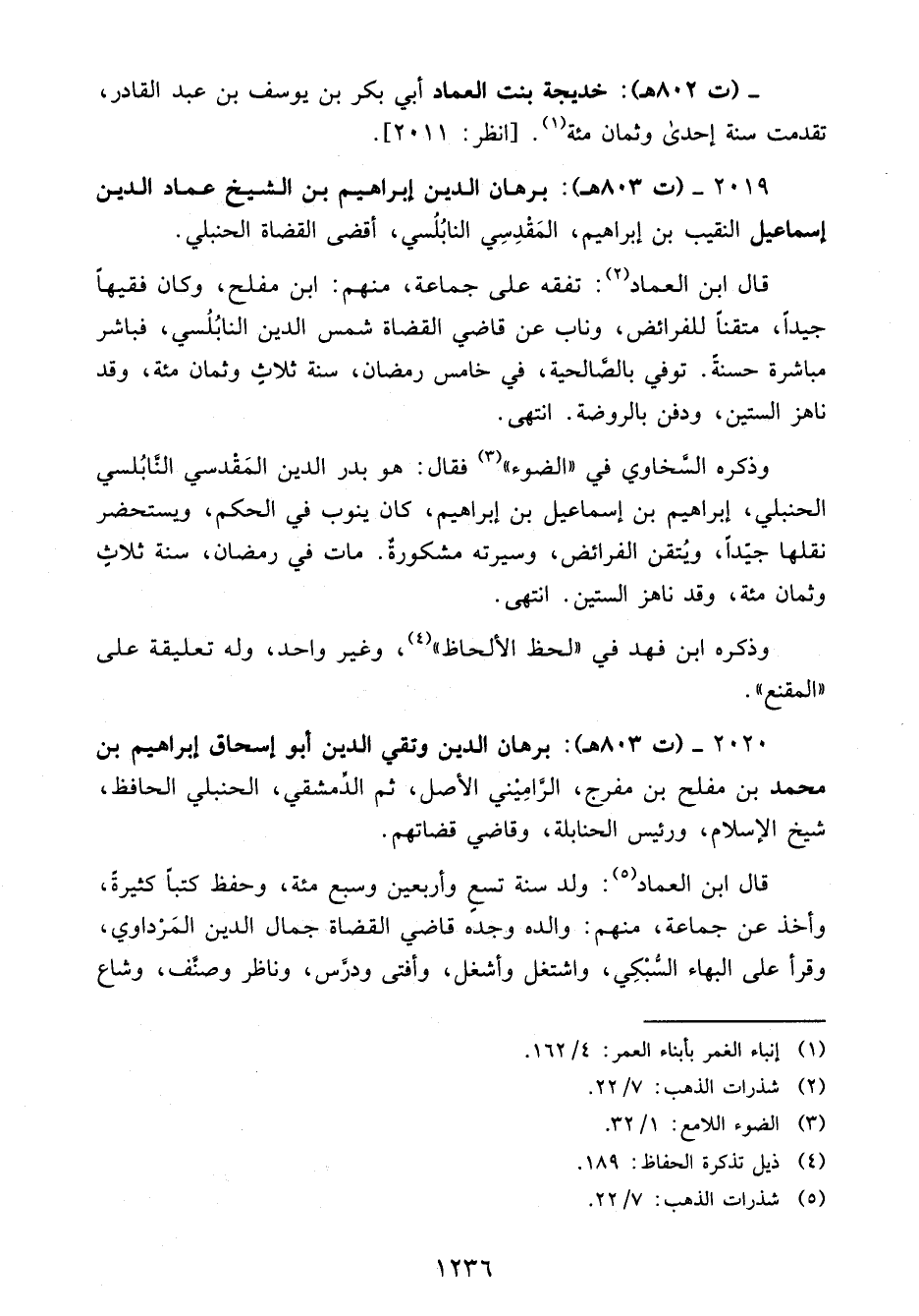 2020 - (ت 803 هـ): برهان الدين وتقي الدين أبو إسحاق إبراهيم بن محمد بن مفلح بن مفرج، الرَّامِيْني الأصل، ثم الدِّمشقي، الحنبلي الحافظ، شيخ الإسلام، ورئيس الحنابلة، وقاضي قضاتهم.