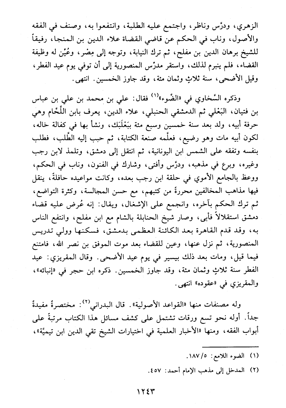 وذكره السَّخاوي في "الضَّوء" (¬1) فقال: علي بن محمد بن علي بن عباس بن فتيان، البَعْلي ثم الدمشقي الحنبلي، علاء الدين، يعرف بابن اللَّحَّام وهي حرفة أبيه، ولد بعد سنة خمسين وسبع مئة ببَعْلَبَك، ونشأ بها في كفالة خاله، لكون أبيه مات وهو رضيع، فعلَّمه صنعة الكتابة، ثم حبب إليه الطَّلب، فطلب بنفسه وتفقه على الشمس ابن اليونانية، ثم انتقل إلى دمشق، وتلمذ لابن رجب وغيره، وبرع في مذهبه، ودرَّس وأفتى، وشارك في الفنون، وناب في الحكم، ووعظ بالجامع الأموي في حلقة ابن رجب بعده، وكانت مواعيده حافلةً، ينقل فيها مذاهب المخالفين محررةً من كتبهم، مع حسن المجالسة، وكثرة التواضع، ثم ترك الحكم بآخره، وانجمع على الإشغال، ويقال: إنه عُرض عليه قضاء دمشق استقلالًا فأبى، وصار شيخ الحنابلة بالشام مع ابن مفلح، وانتفع الناس به، وقد قدم القاهرة بعد الكائنة العظمى بدمشق، فسكنها وولي تدريس المنصورية، ثم نزل عنها، وعين للقضاء بعد موت الموفق بن نصر الله، فامتنع فيما قيل، ومات بعد ذلك بيسير في يوم عيد الأضحى. وقال المقريزي: عيد الفطر سنة ثلاثٍ وثمان مئة، وقد جاوز الخمسين. ذكره ابن حجر في "إنبائه"، والمقريزي في "عقوده" انتهى.