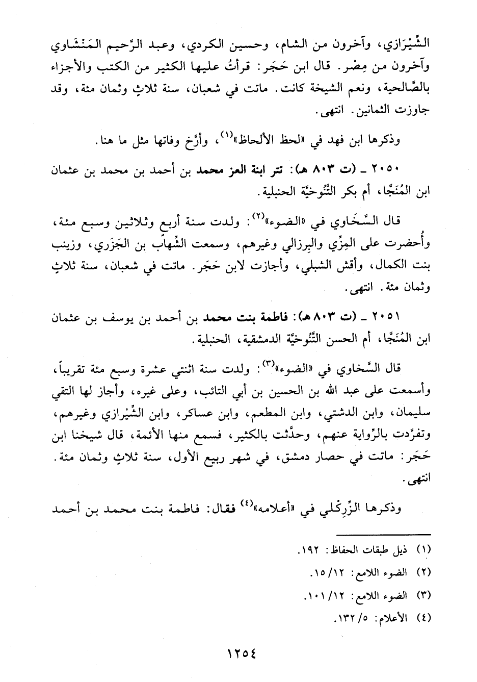 2051 - (ت 803 هـ): فاطمة بنت محمد بن أحمد بن يوسف بن عثمان ابن المُنَجَّا، أم الحسن التَّنُوخيَّة الدمشقية، الحنبلية.