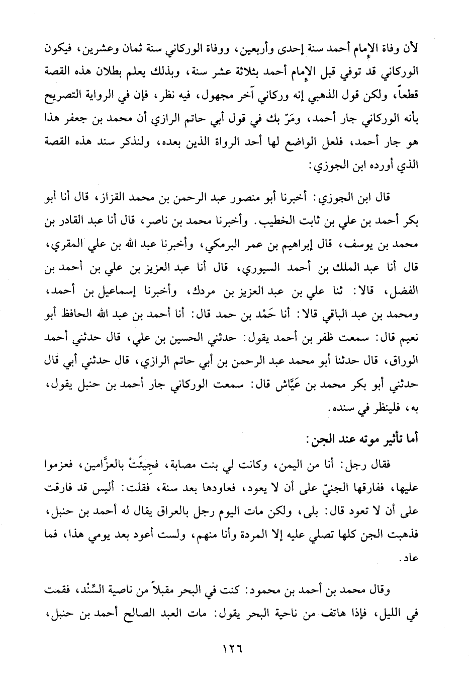 لأن وفاة الإمام أحمد سنة إحدى وأربعين، ووفاة الوركاني سنة ثمان وعشرين، فيكون الوركاني قد توفي قبل الإِمام أحمد بثلاثة عشر سنة، وبذلك يعلم بطلان هذه القصة قطعًا، ولكن قول الذهبي إنه وركاني آخر مجهول، فيه نظر، فإن في الرواية التصريح بأنه الوركاني جار أحمد، ومَرّ بك في قول أبي حاتم الرازي أن محمد بن جعفر هذا هو جار أحمد، فلعل الواضع لها أحد الرواة الذين بعده، ولنذكر سند هذه القصة الذي أورده ابن الجوزي:
