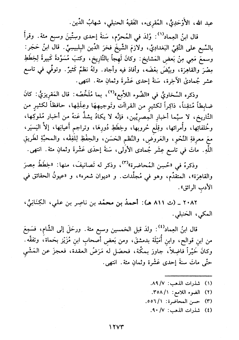 وذكره السَّخاويُّ في "الضَّوء اللَّامِع" (¬2)، بما مُلَخَّصُه: قال المَقرِيزيُّ: كانَ ضابِطًا مُتقِنًا، ذاكِرًا لكثيرٍ من القراآت وتَوجيهِهَا وعِلَلِها، حافظًا لكثيرِ من التَّاريخ، لا سيَّما أخبارِ المِصرِيِّين، فإنَّه لا يكادُ يشذُّ عَنهُ من أخبار مُلوكِها، وخُلفائِها، وأُمرائها، وقِلَعِ حُروبها، وخِطَطِ دُورِهَا، وتراجمِ أَعيانِها، إلَّا اليَسيرَ، معَ معرِفةِ النَّحْوِ، والعَروضِ، والنَّظمِ الحَسَن، والحِفْظِ لِلفِقْه، والمحبَّةِ لطَريقِ اللهِ. ماتَ في تاسع عشَر جُمادى الأولى، سَنةَ إحدَى عَشْرةَ وثمانِ مئة. انتهى.