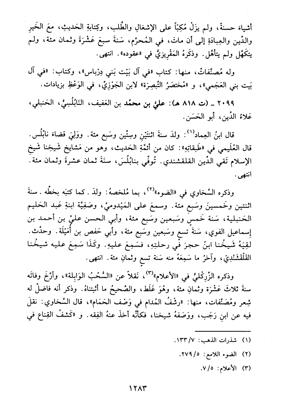 2099 - (ت 818 هـ): علي بن محمَّد بن العَفيف، النَابُلُسِيُّ، الحَنبلي، عَلاءُ الدَّين، أبو الحَسَن.