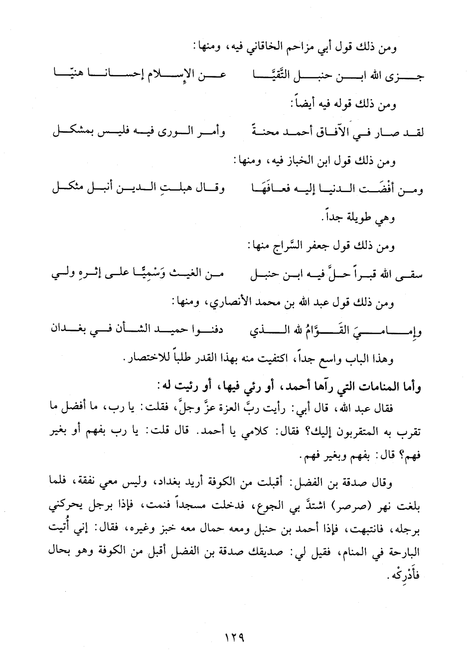 فقال عبد الله، قال أبي: رأيت ربَّ العزة عزَّ وجلَّ، فقلت: يا رب، ما أفضل ما تقرب به المتقربون إليك؟ فقال: كلامي يا أحمد. قال قلت: يا رب بفهم أو بغير فهم؟ قال: بفهم وبغير فهم.