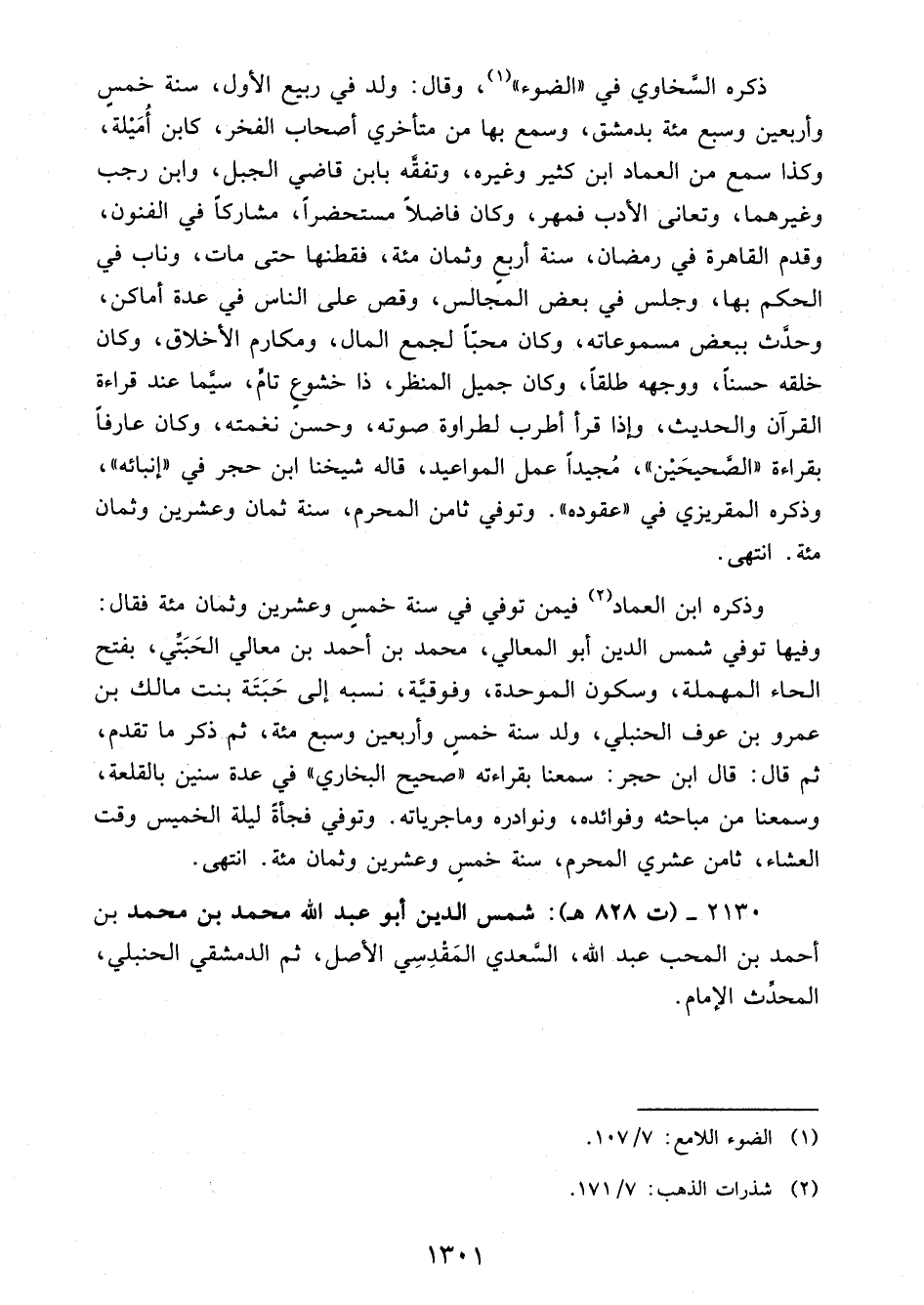 2130 - (ت 828 هـ): شمس الدين أبو عبد الله محمد بن محمد بن أحمد بن المحب عبد الله، السَّعدي المَقْدِسِي الأصل، ثم الدمشقي الحنبلي، المحدِّث الإمام.
