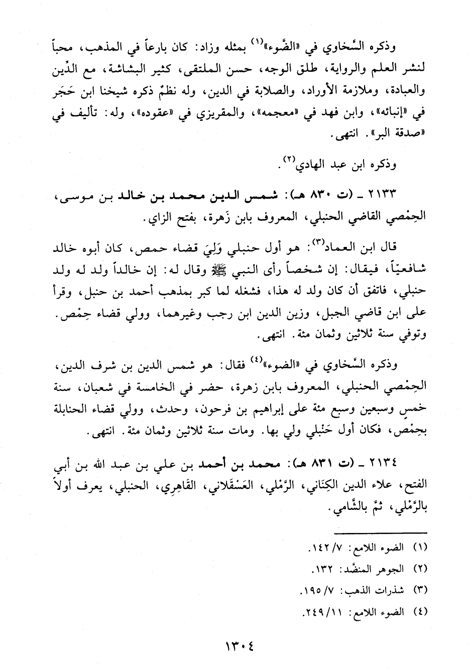 2134 - (ت 831 هـ): محمد بن أحمد بن علي بن عبد الله بن أبي الفتح، علاء الدين الكِنَاني، الرَّمْلي، العَسْقَلاني، القَاهِرِي، الحنبلي، يعرف أولًا بالرَّمْلي، ثمَّ بالشَّامي.